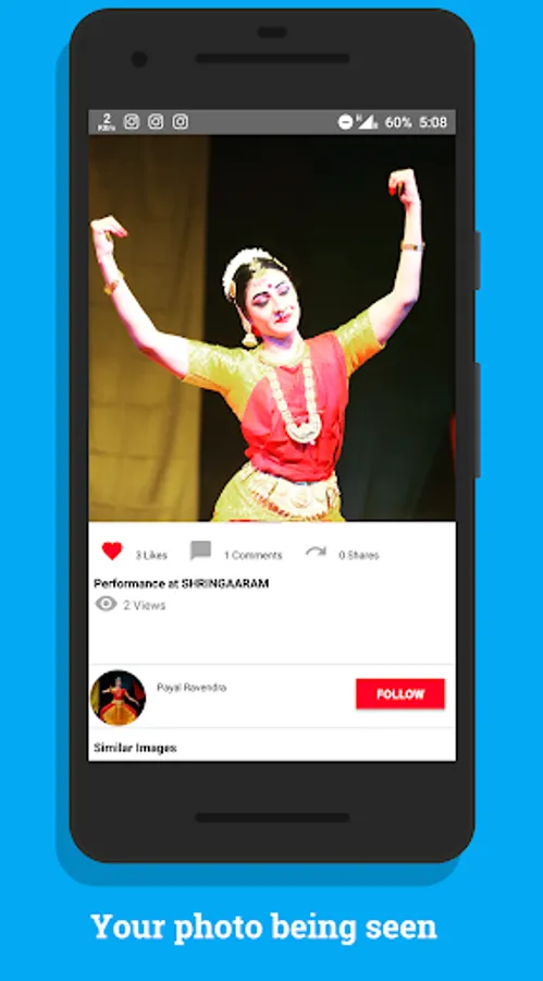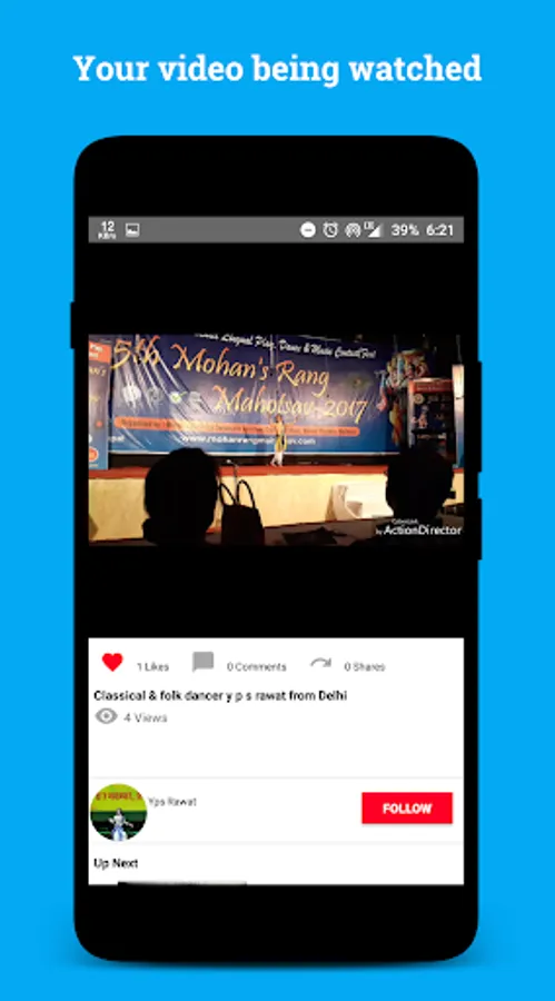 Home/Feed: This section lets the user share their dance videos and images. A user can here follow the other users. A user can here like the videos uploaded by others, can comment on them, and can share them on other platforms.