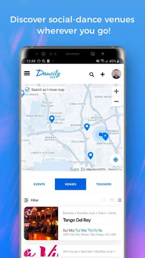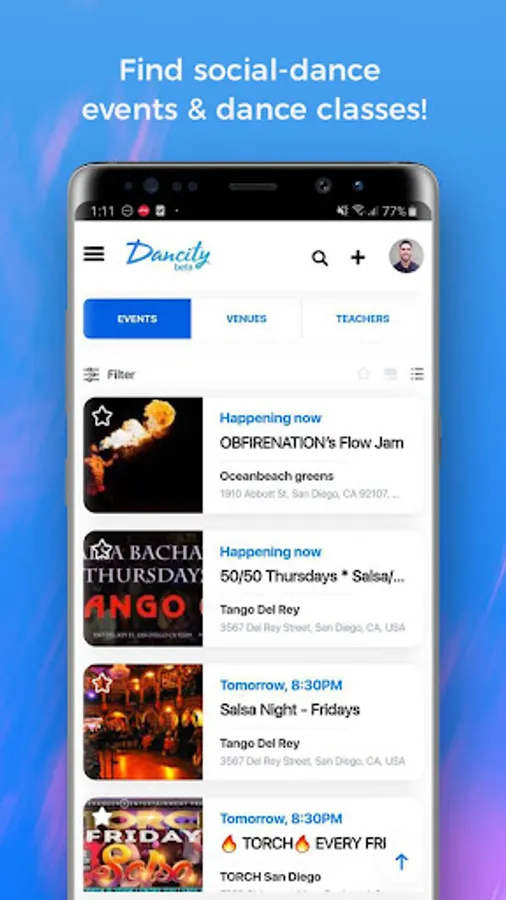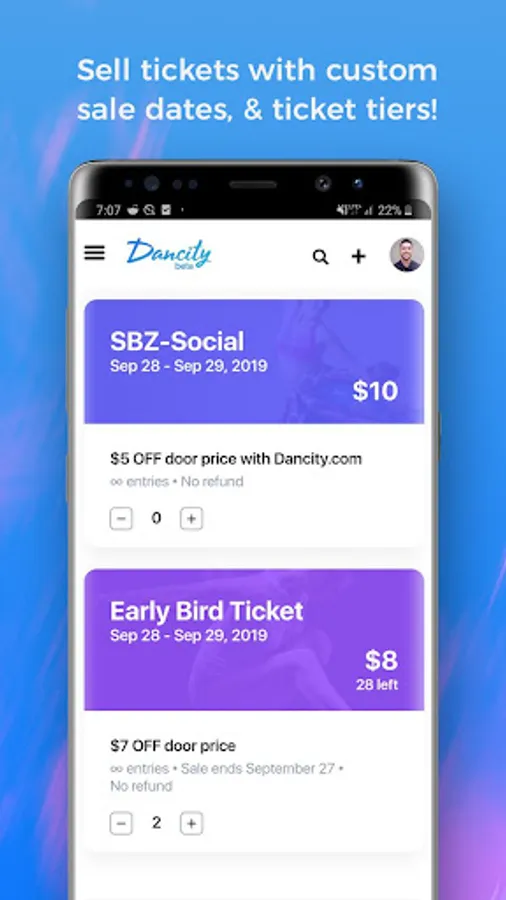Dancity is an app for a social dancing network that allows event promoters, venue owners, and teachers to post their social-dance events as well as sell tickets to those events on a single platform