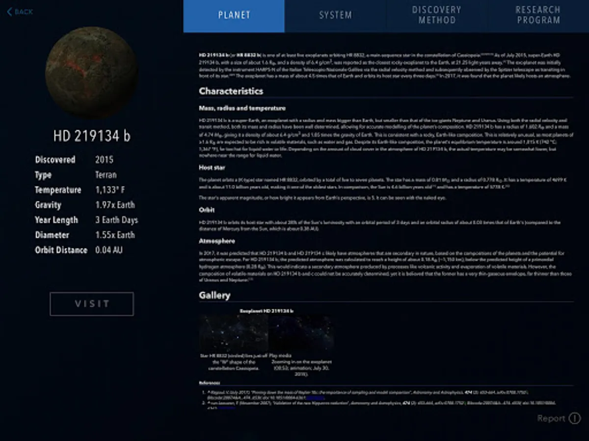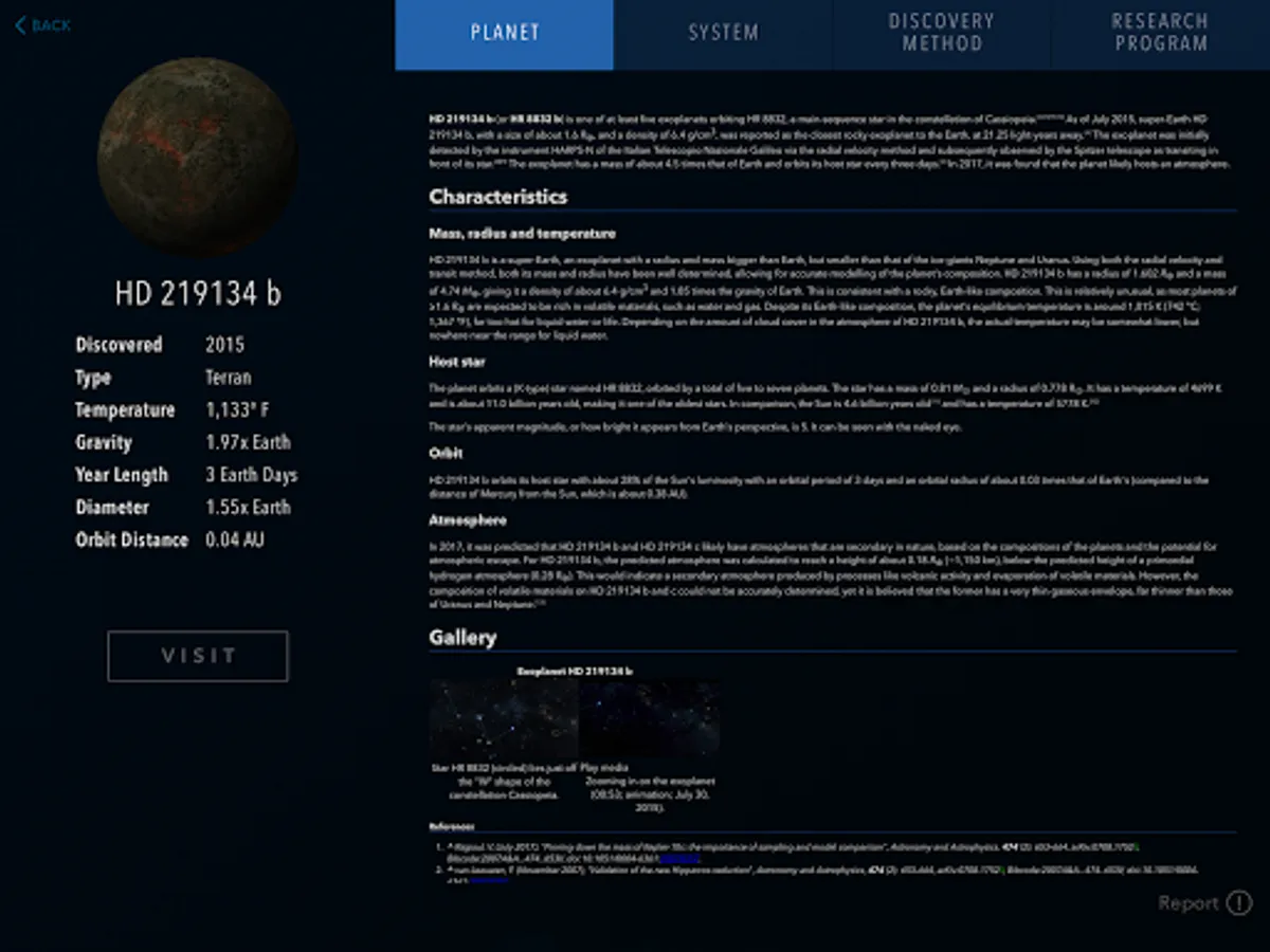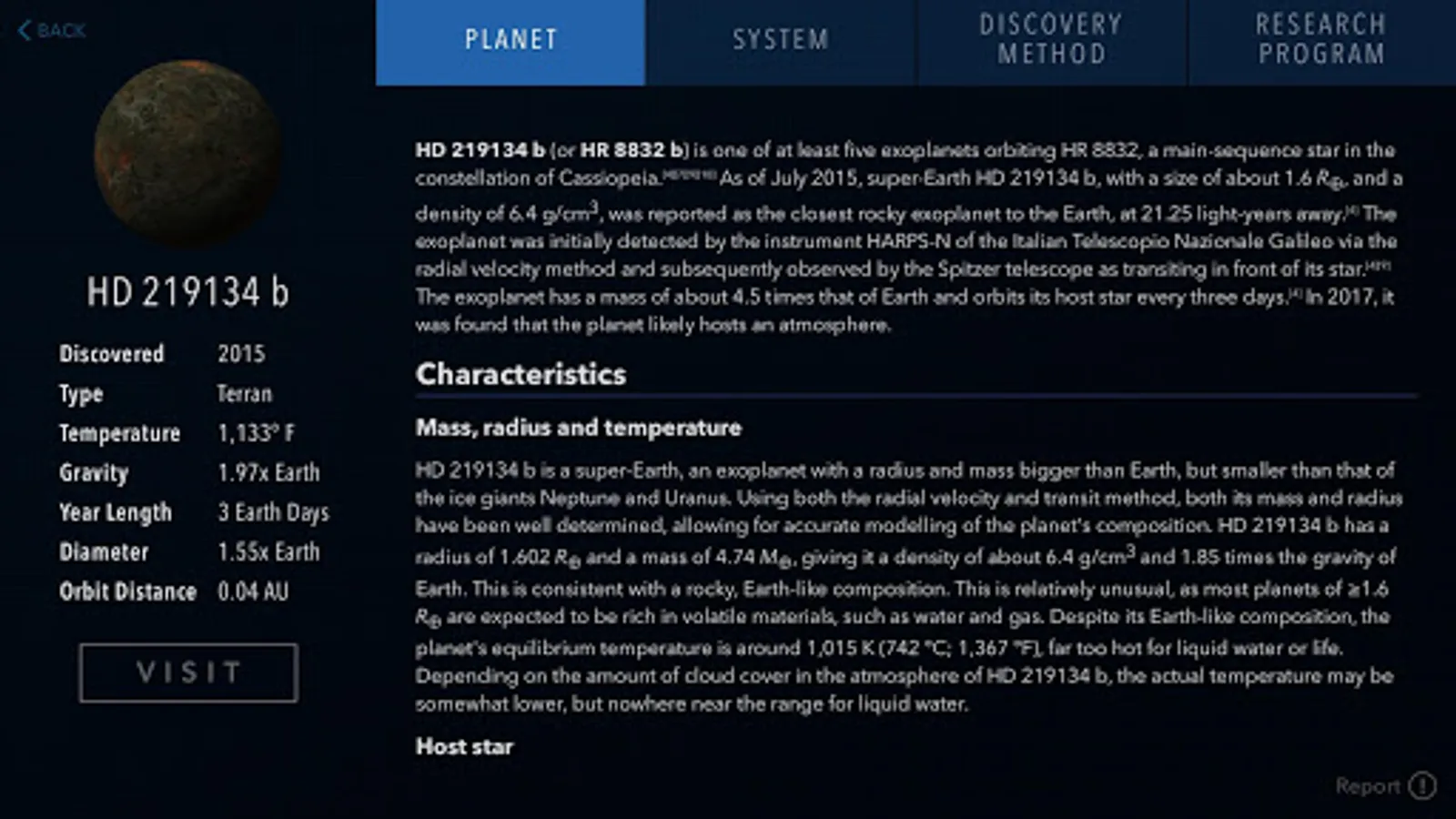 • Data-rich information panel to learn about a given planet’s attributes, parent system, discovery method, and research program credited with its discovery