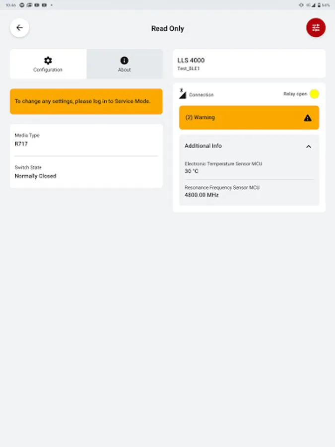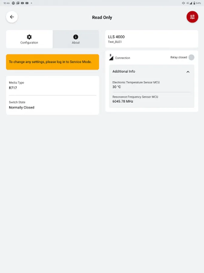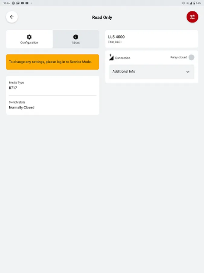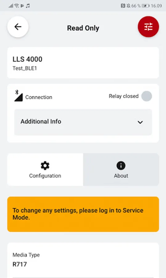 For the non-SIL2 variant of the LLS 4000, the app enables you to select between several media1 and select switch function as normally open (NO) or normally closed (NC).
