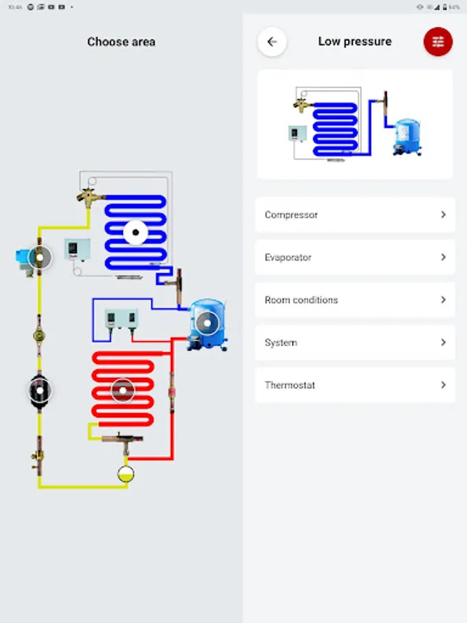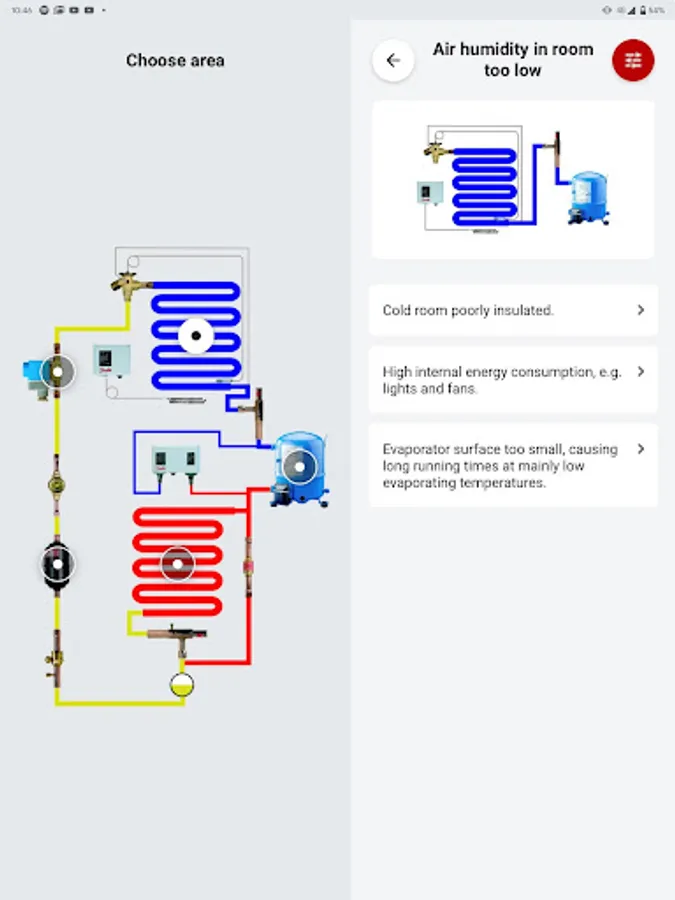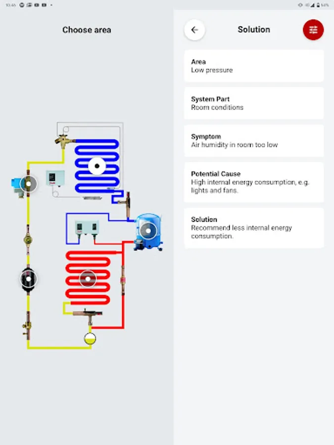 When you start up Troubleshooter, you’ll see a refrigeration system divided into four main areas: low pressure, high pressure, compressor, and liquid line components. Select one of the four areas and you will be able to search through potential symptoms for that area in the system. Once you identify the correct symptom, Troubleshooter will show you the possible causes for that symptom and the steps required to correct it. It’s easy to move back and forth between the symptom/cause and the solution pages.