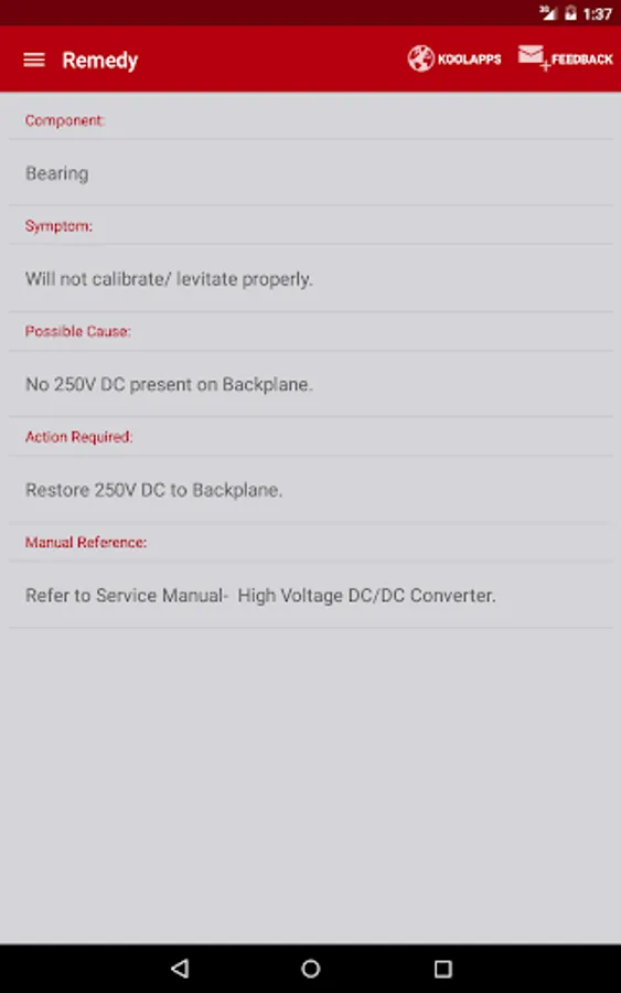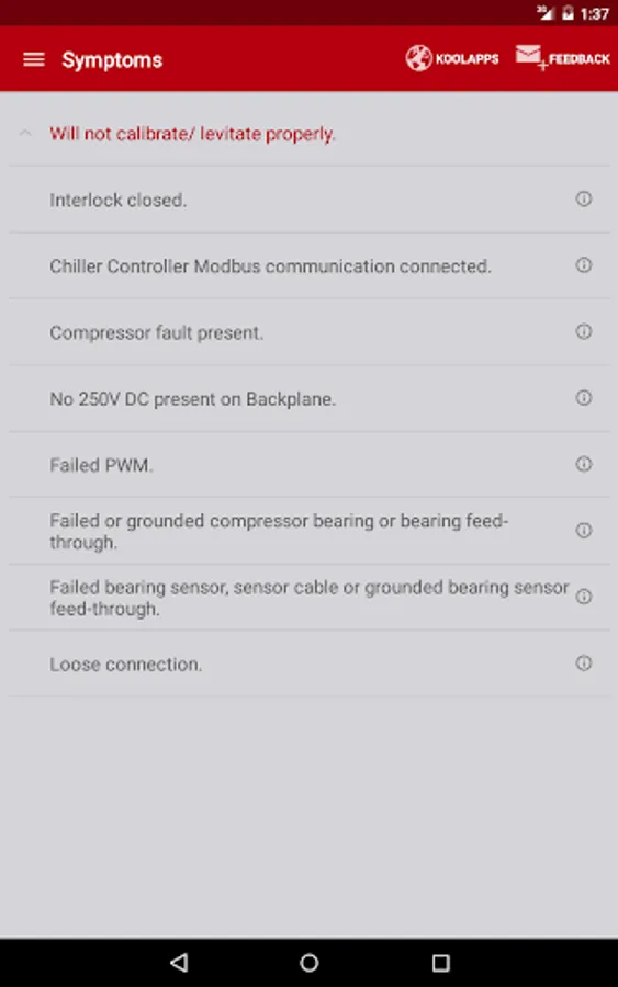 When you select the area you want to focus on, the app takes you to the “Symptoms” page. There, you can search for the symptom(s) being exhibited by the system or component. Once you identify the correct symptom, you can select and expand it to reveal the possible causes.