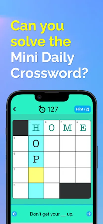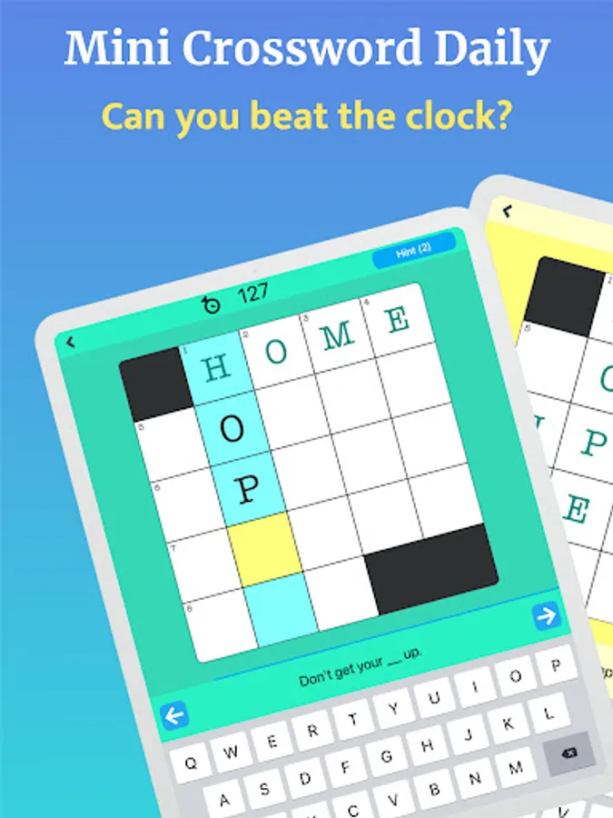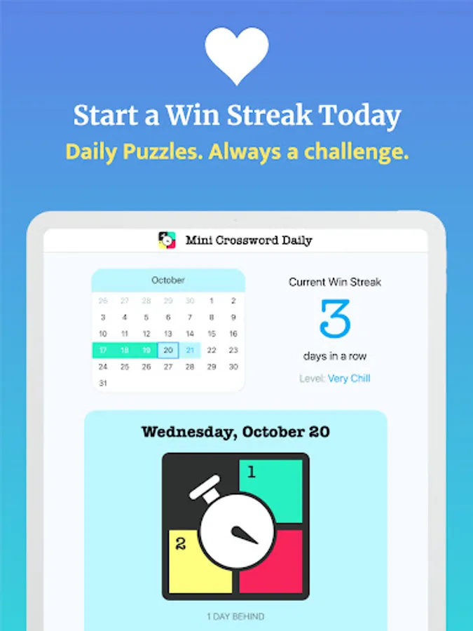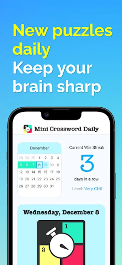 Mini Crossword Daily is a daily mini crossword puzzle game. Solve the daily tiny puzzle before the timer hits zero to keep your win streak alive. Stay focused as the screen changes color and the clock ticks down. Do you have what it takes?