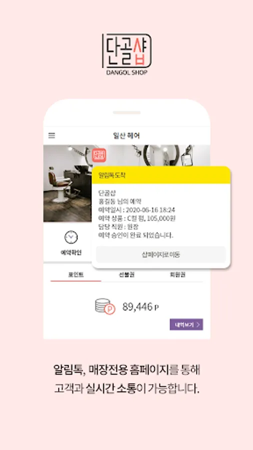 - 예약, 포인트적립, 선불권/회원권 사용정보, 서비스 이력 등 고객에게 필요한 모든 정보는 알림톡으로 자동으로 알려주며, 언제든 매장 홈페이지를 통해 조회가 가능합니다.