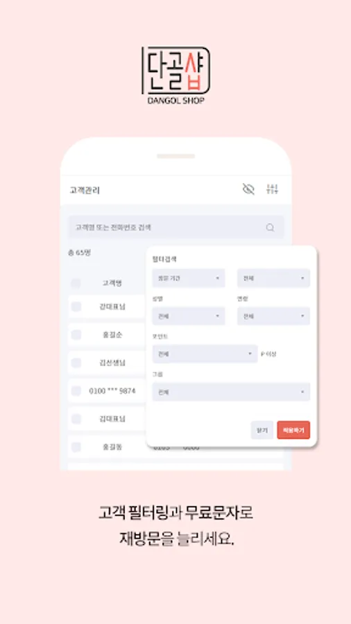 - 고객 프로필, 방문기간, 서비스 이력을 고려한 필터링 기능으로 문자 마케팅 반응율을 올리세요. (문자 요금은 관리자가 사용하는 휴대폰 요금제 제한 건수 내에서 무료로 발송 가능합니다.)