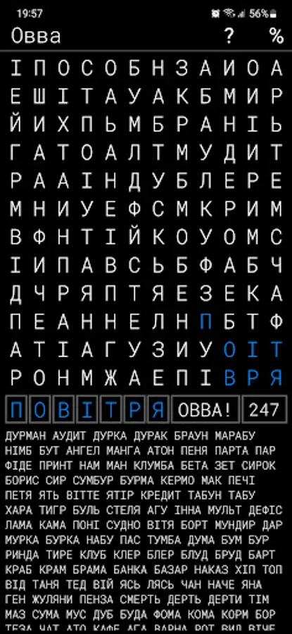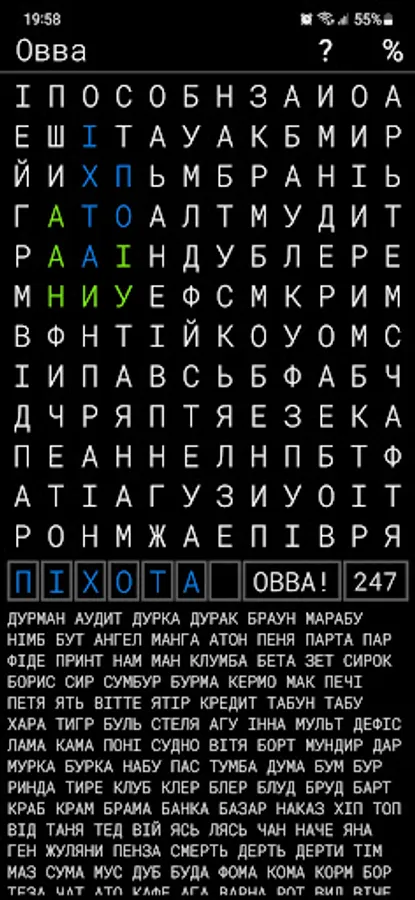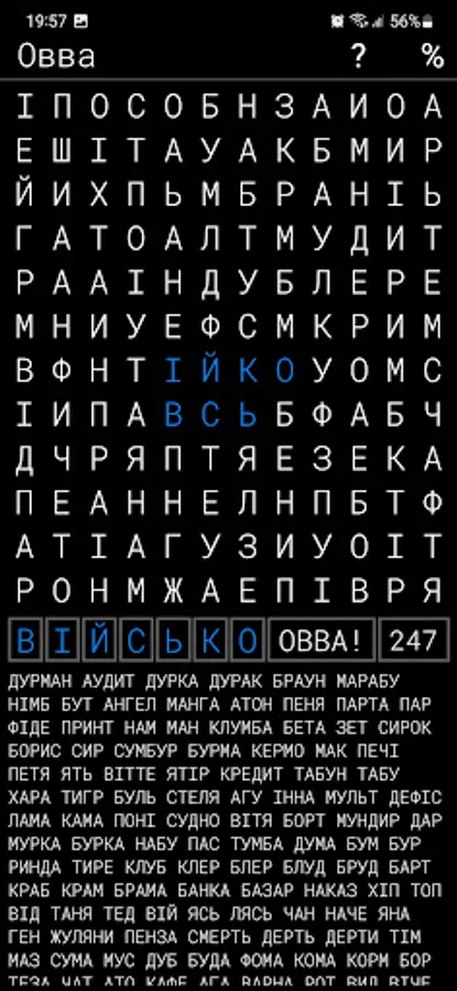OVVA is a daily crossword puzzle. Each day you receive a set of 144 letters. Your task is to find among them as many real Ukrainian words with a length of 3 to 7 letters as possible. Each player receives an identical set of letters on the same day. So you can compete with your friends and family.