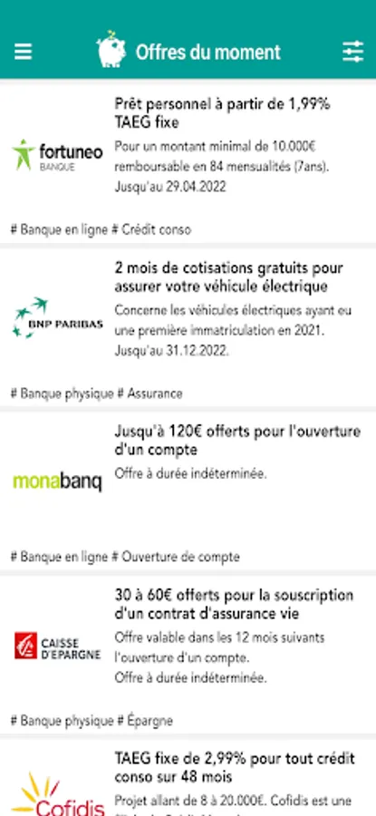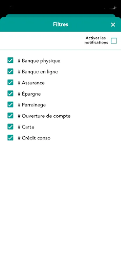First, select the subjects that interest you from a wide choice in the filter tab: Physical Banking, Online Banking, Insurance, Savings, Sponsorship, Credit, Cards, etc.