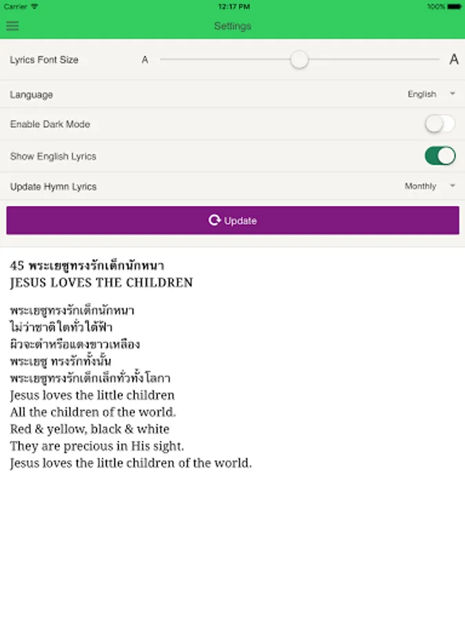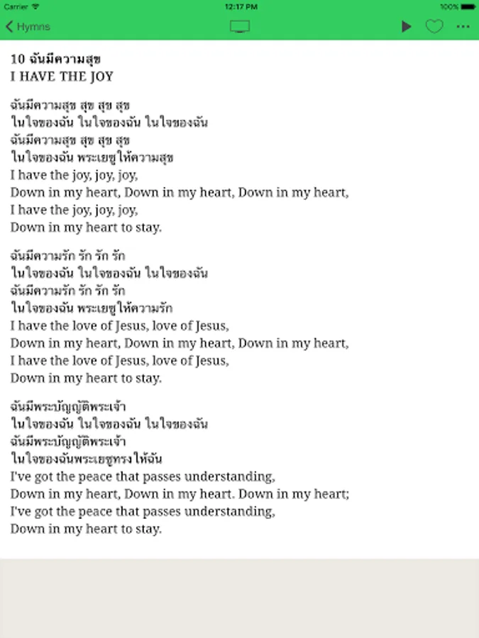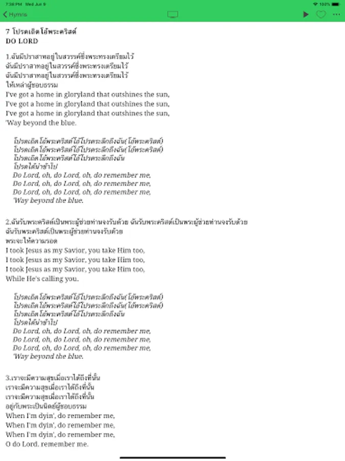 Original Thai lyrics with corresponding English for most hymns.