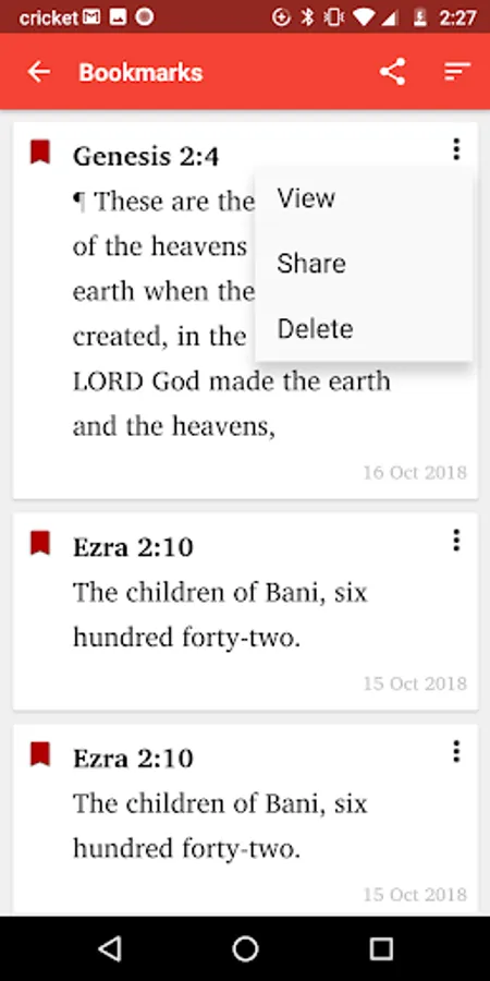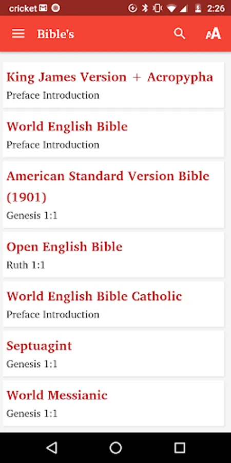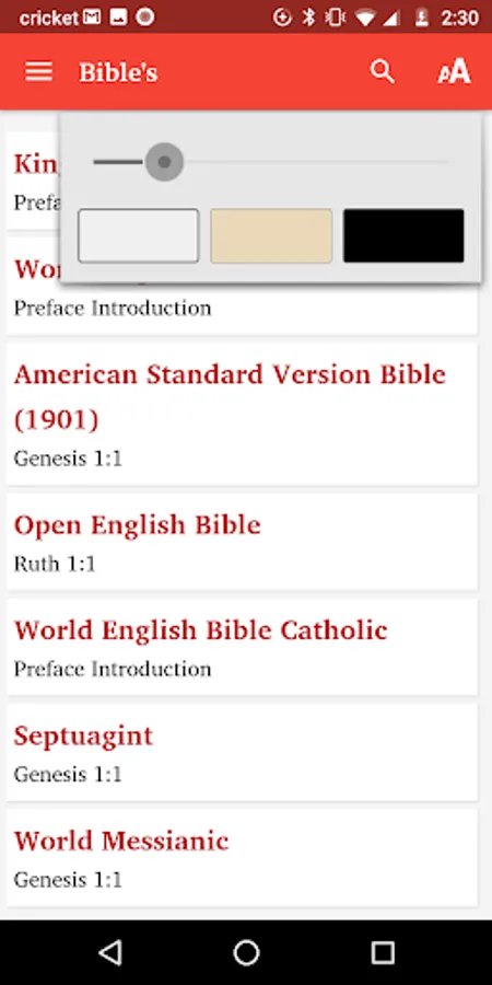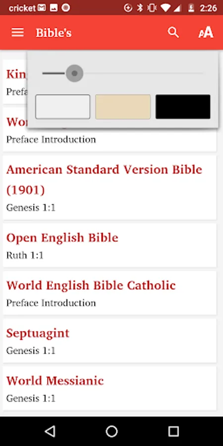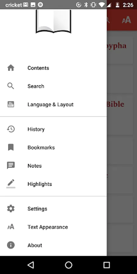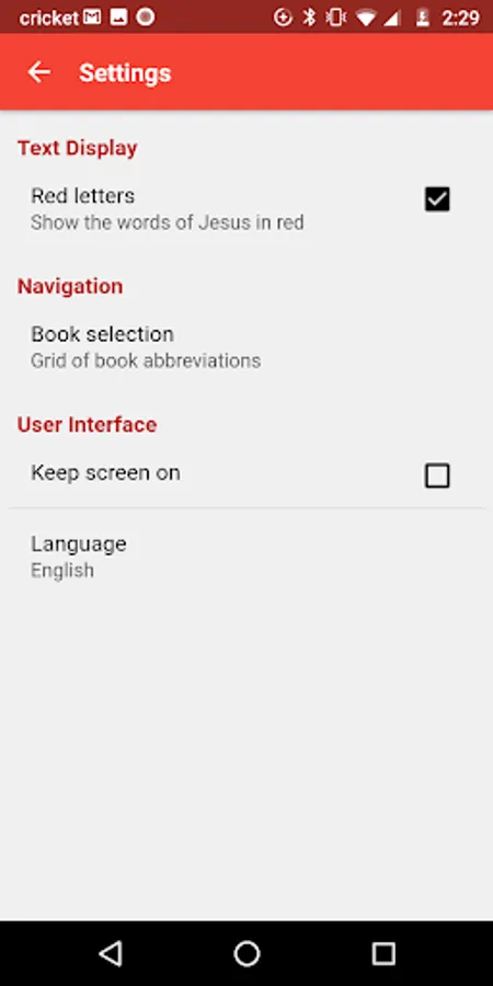 ● Settings: Text display, show the words of Jesus in red, Navigation, View the Bible books in Grid of book abbreviations, or List of book name.