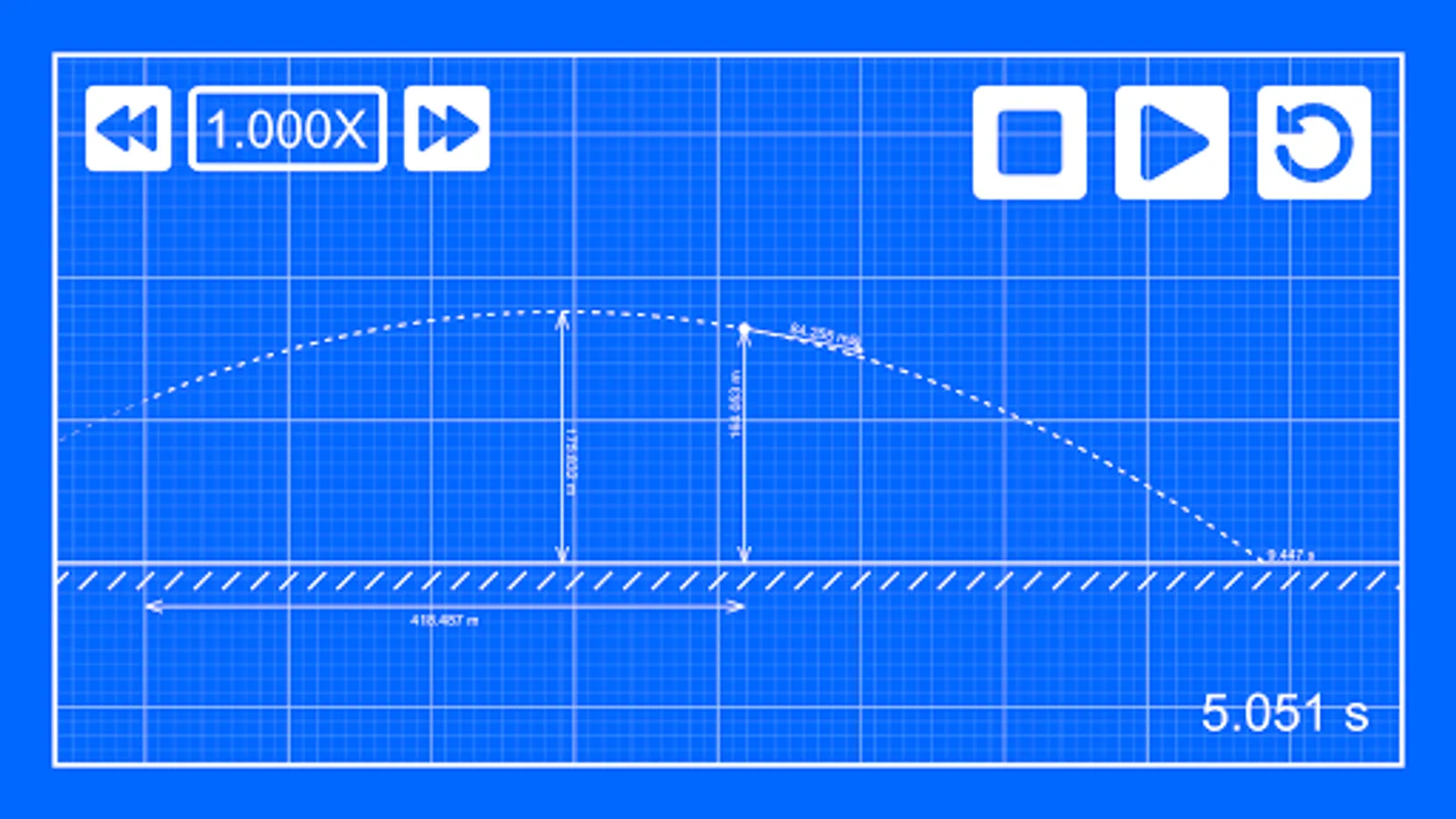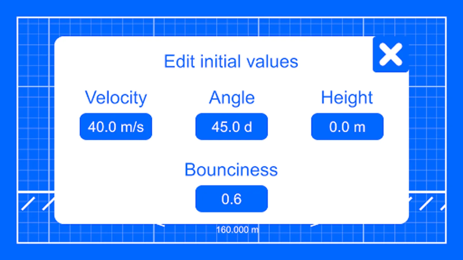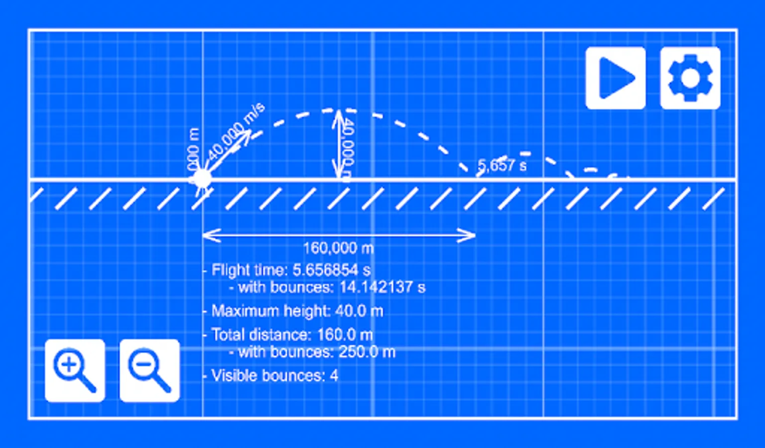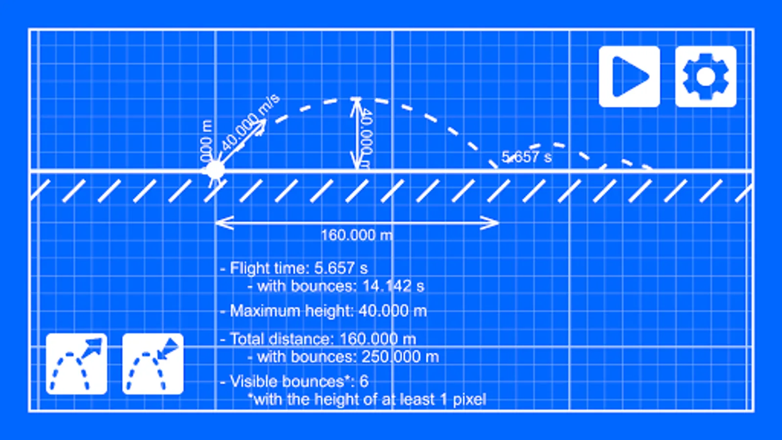 From the initial values (velocity, angle, height, bounciness) the app calculates: