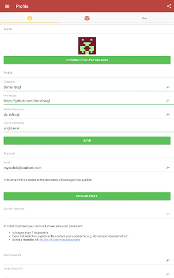 - Manage your npm account like you would normally do on npmjs.com
