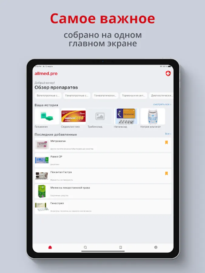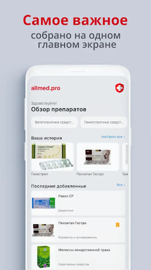 The Allmed PRO Drug Directory contains a detailed description of medicines, namely: prescription examples, description of prescription forms, pharmacodynamics, pharmacokinetics, special indications, method of administration and description of drug interactions. The reference book of medicines is an indispensable thing in study and work.