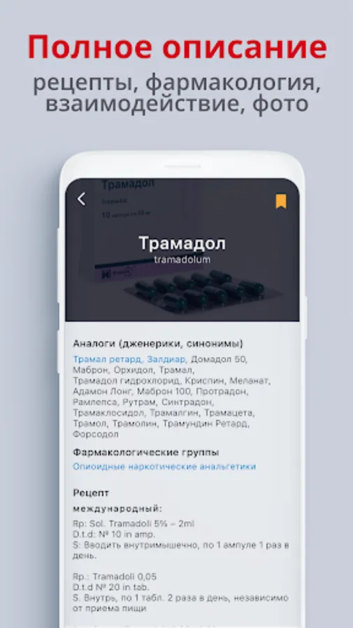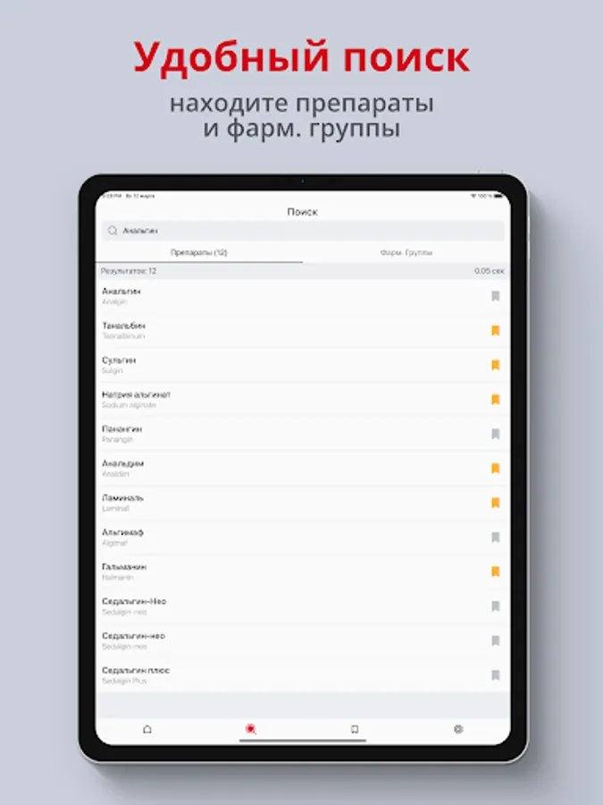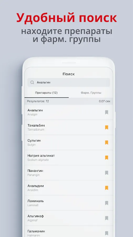 A very fast and smart search in the application will allow you to find the right drug or pharmacological group in just a few letters, and will give you all the information about the element you are looking for, including categorization by pharmacological groups, a detailed description of analogues and other information.