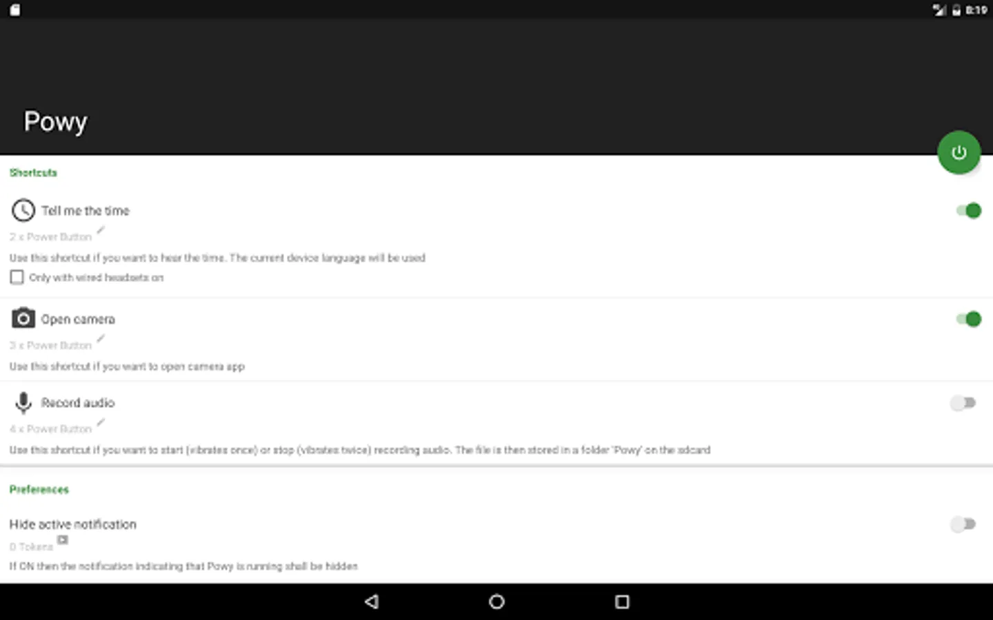 After starting Powy you just have to calmly press the power button the number of times that match the configured shortcut you desire to trigger.