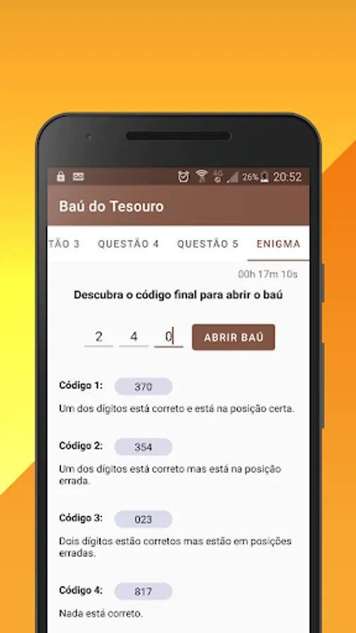 The goal is to open the treasure chest and get the reward, but to achieve this you need to answer the questions, collect the codes and solve the puzzle!