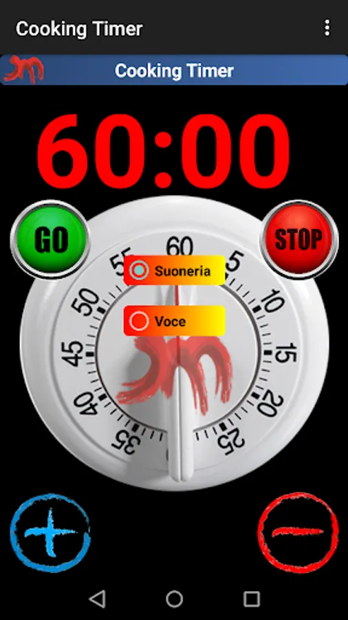 Cooking Timer is a stopwatch to semolice the cook. Of course it can also be used in other circumstances to a maximum of 60 minutes. The time can be increased or decreased in 5-minute intervals. E 'can select the voice or audible alarm. E 'possible selection of the time interval of the intermediate alerts, from 5 to 55 minutes.