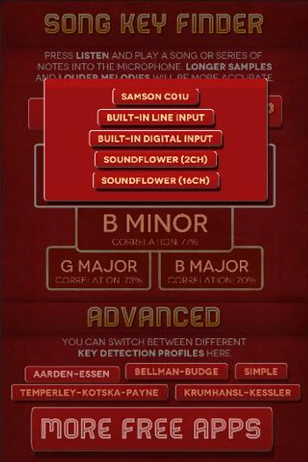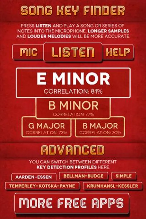 Based on modern pitch and key detection algorithms, Song Key Finder provides astonishing results. Great for bands, songwriters, tabulature transcribers, and anyone interested in learning how to play their favorite songs.
