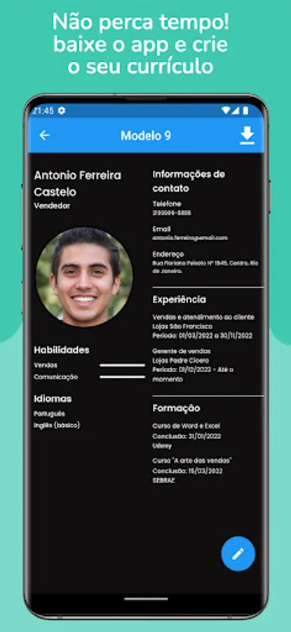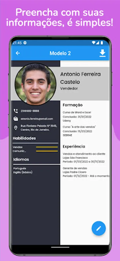 In addition, the application offers tips for creating a professional resume, helping you to assemble your resume on your cell phone in an uncomplicated way. Our resume templates and resume examples are designed to meet the specific needs of the Brazilian market, including resume vitae and ready-to-edit resume.