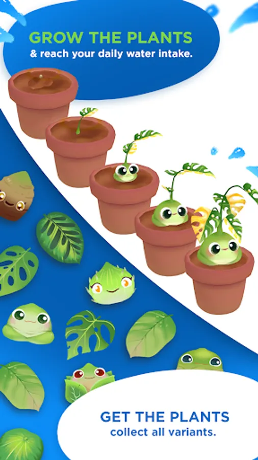 There are 5 stages of evolution of your plant that grow with your daily hydration streaks. You will start as seed, that later will grow to a full-grown plant! Once you have a full grown plant, you can keep it, or you can evolve it into another plant! There are many plant combinations you can unlock and grow with the DNA system, using in-game Evolve points. You can change your plant face, stem, and leaf as you wish, and collect them all in your garden!