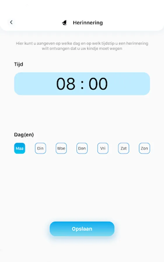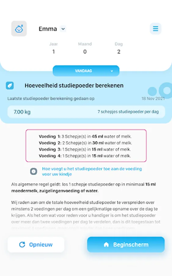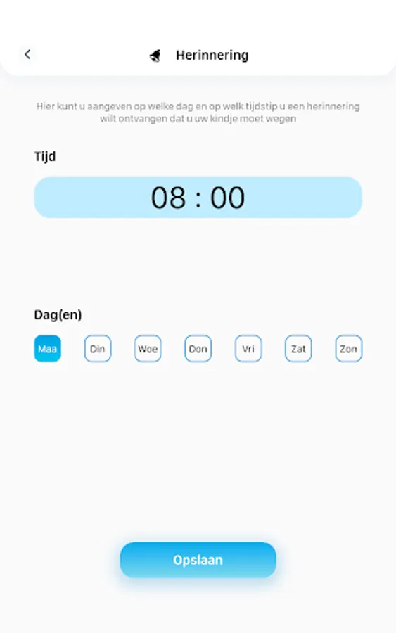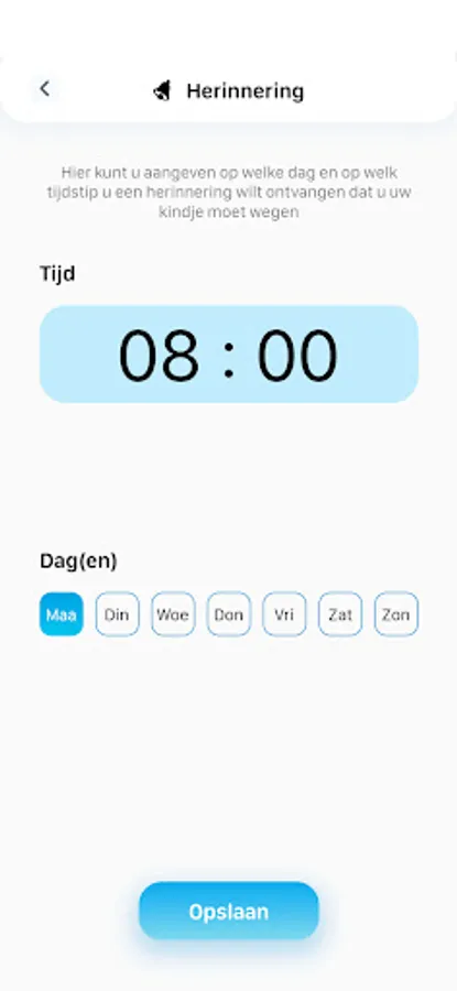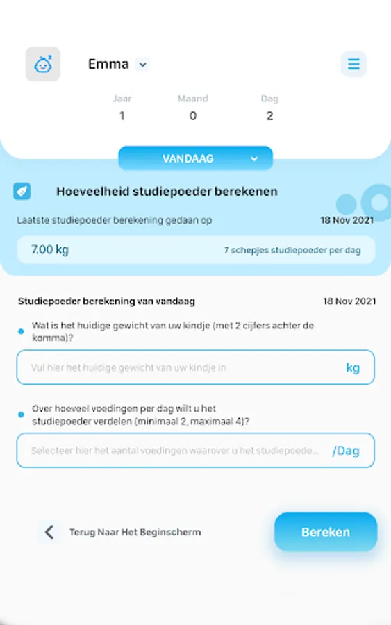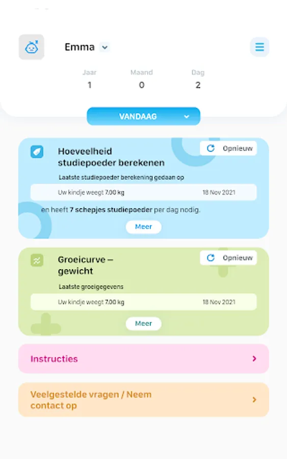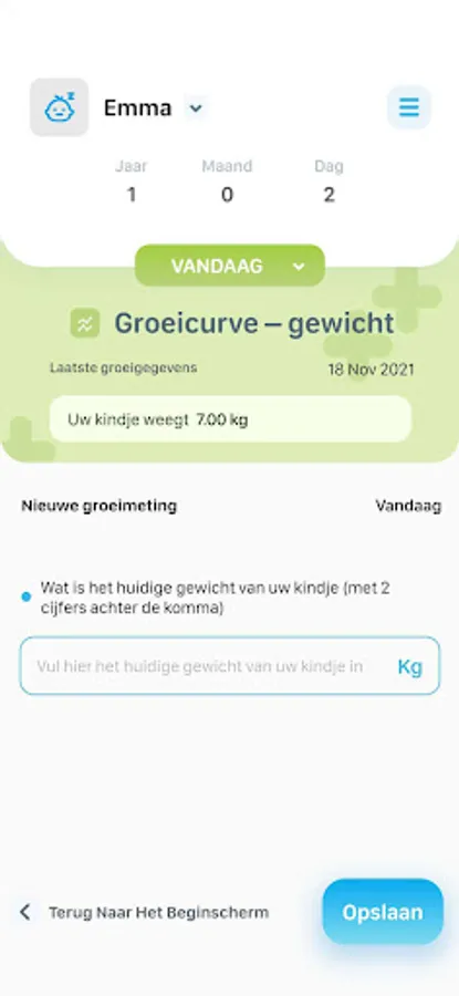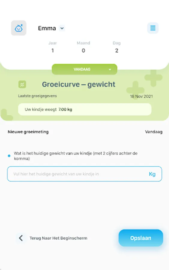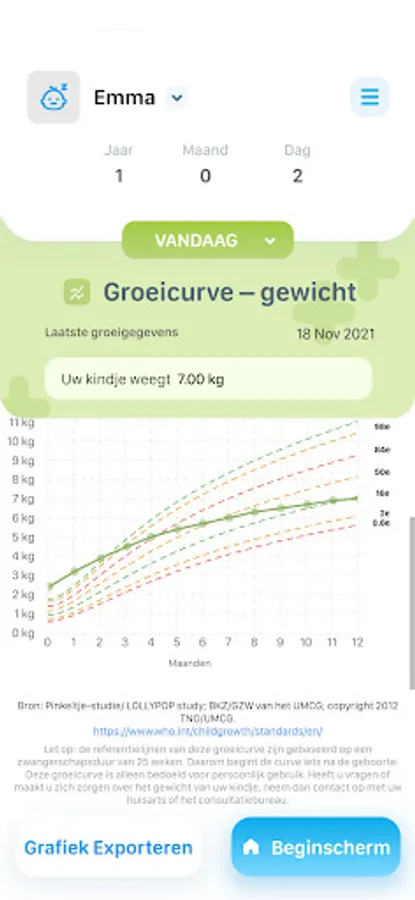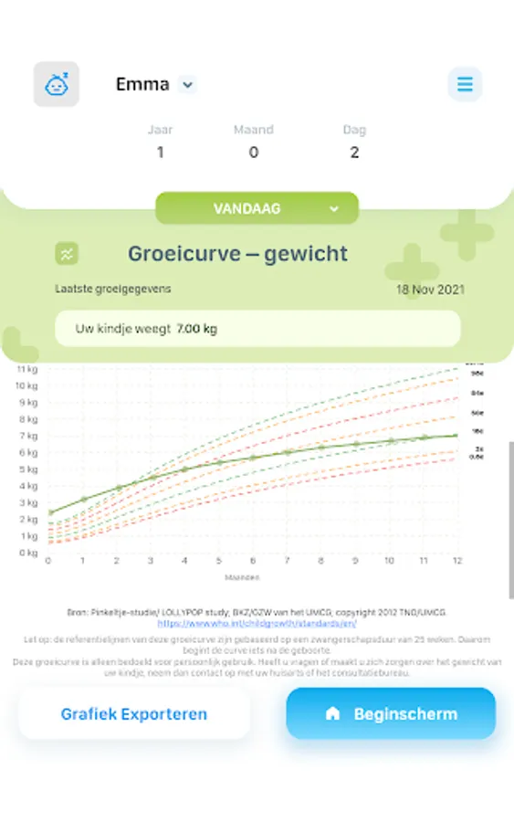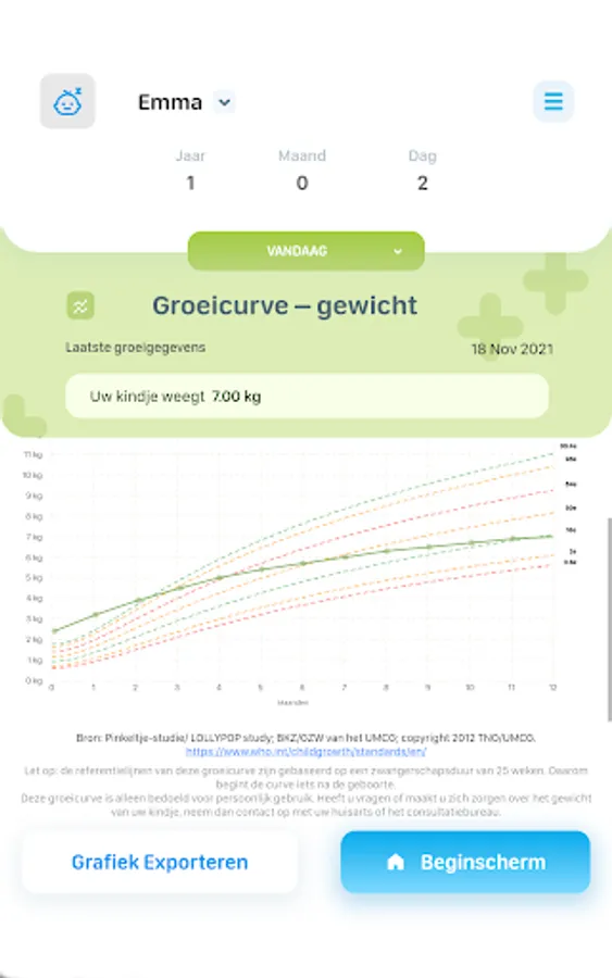 De app slaat informatie alleen op uw eigen telefoon op en er worden geen gegevens verzameld via de app. Alle gegevens die u invoert in de app zijn dus alleen toegankelijk voor uzelf. Het is ook mogelijk om het gewichtsverloop van uw kindje weer te geven in een groeidiagram. Deze groeidiagrammen zijn gebaseerd op de zwangerschapsduur bij de geboorte van uw kindje.