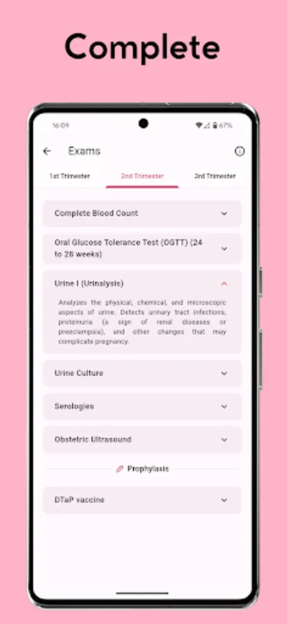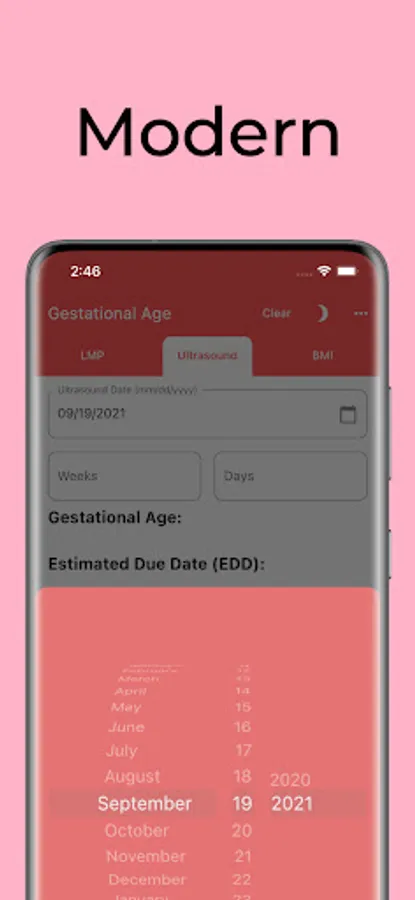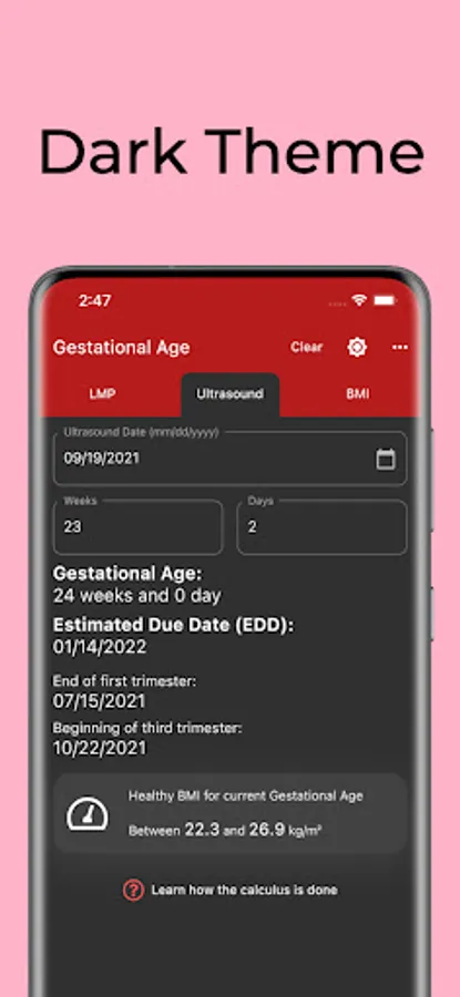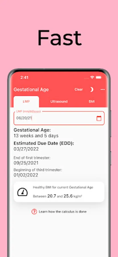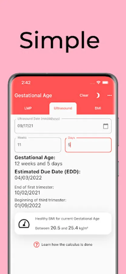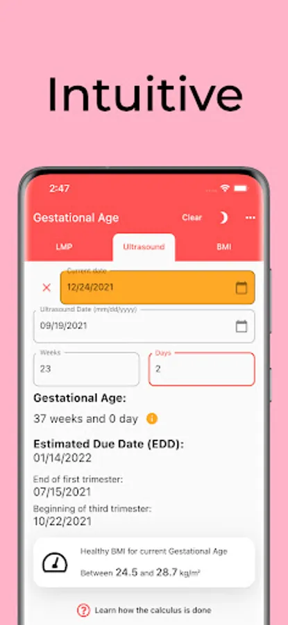 The app features a practical and intuitive gestational BMI calculator, essential for the weight management of the pregnant women. BMI recommendation changes as the gestational age increases.
