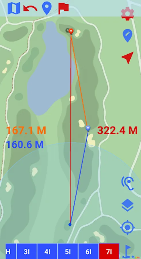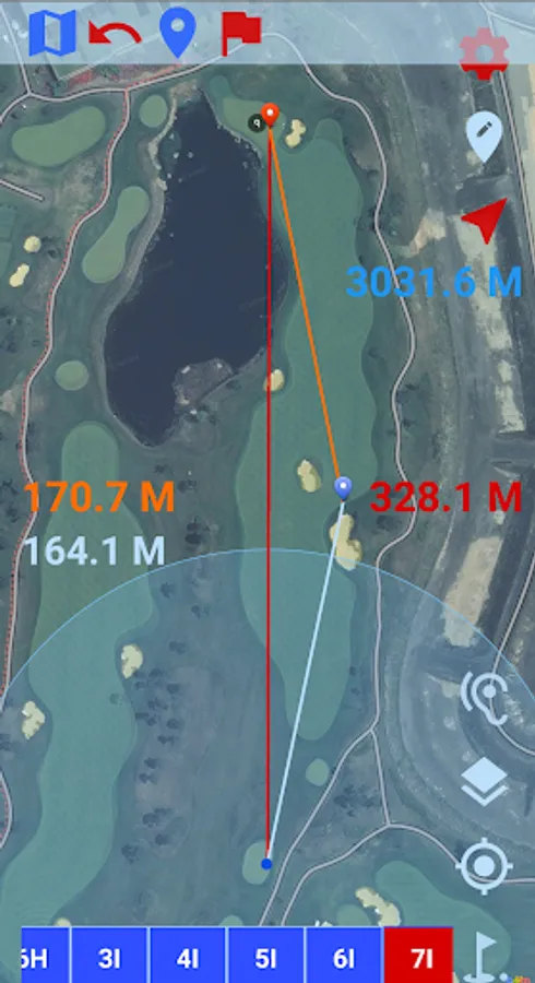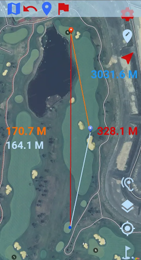 When a golfer taps a pin and midpoint on a map, you can see at a glance the distance from your location to the pin, the distance to the midpoint, and the distance of the pinpoints from the midpoint.