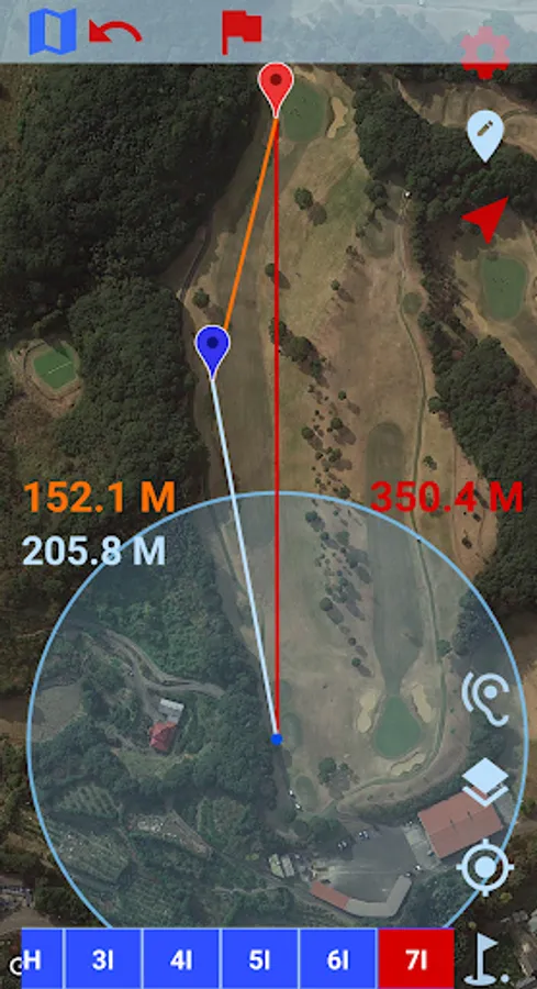 Tapping the pin position and middle point of the hole at my current position reference calculates the distance to each position.