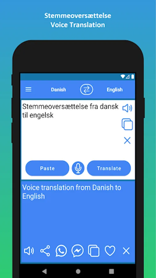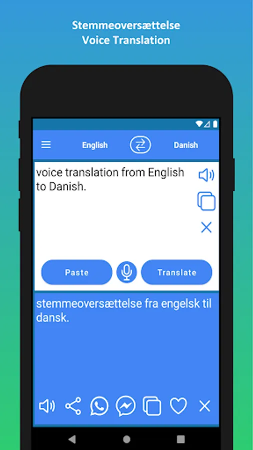 ✓ 6. Del oversat tekst med et enkelt klik til WhatsApp eller FB Messenger.