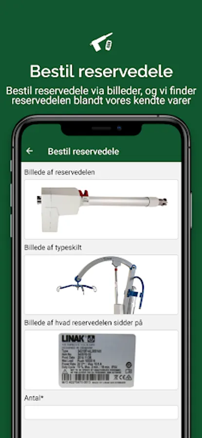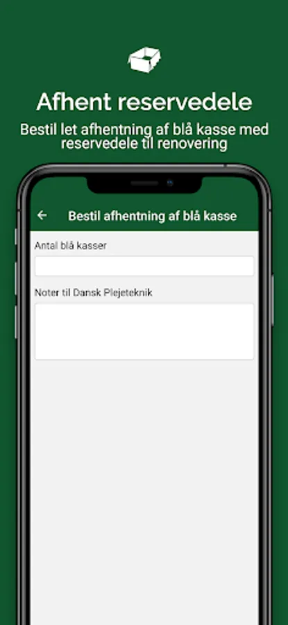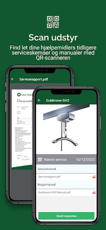 Via QR scanner, you see the latest service reports for your aids as well as the next service date. You can easily order spare parts via item number, description or pictures, Dansk Plejeteknik finds the correct spare part and sends it to you. Order a technician for repair via the app as well as collection of spare parts in a blue box for renovation.