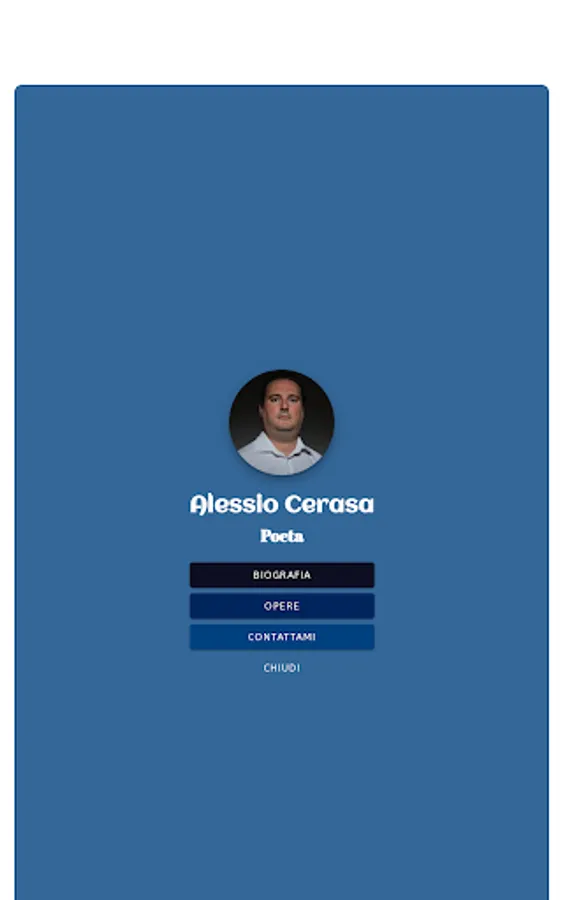 Alessio Cerasa was born in Pescara on 27 March 1982. In 2002 he obtained the Scientific and Technological High School Diploma at the “Guglielmo Marconi” State Teaching Institute in Pescara. He has published two booklets: Revelations, in April 2004, and La torre, in January 2022. The collection of poems Revelations was reviewed in the Abruzzo newspaper Il Centro on 4 January 2005, on the Culture & Society page, while the booklet The tower obtained a review on an information website in Pescara with an article dated August 20, 2022.