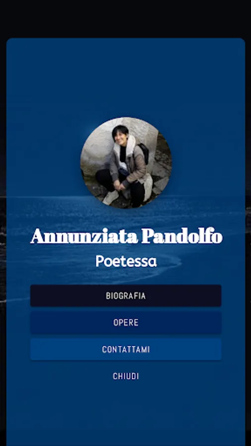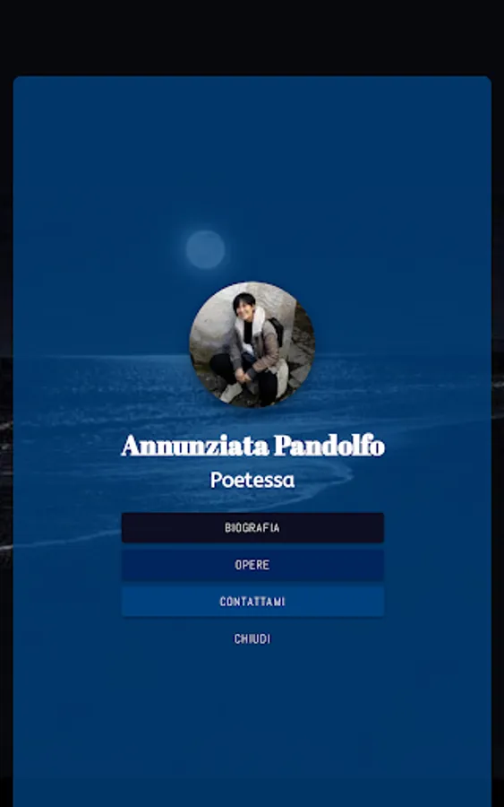 Pandolfo Annunziata, commonly referred to as Tina, was born in Latina in 1960. She attended the teaching institute, enrolled in the faculty of psychology but left her studies early and got married at a young age. She has two daughters and lives with her husband in a seaside resort in the province of Latina. She has always cultivated her passion for literature and culture in general: she likes reading, painting and isolating herself in her imagination by writing poems and stories. He makes use of the master's degree to impart tuition.