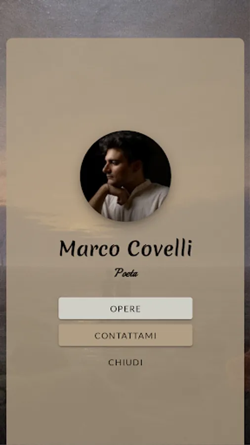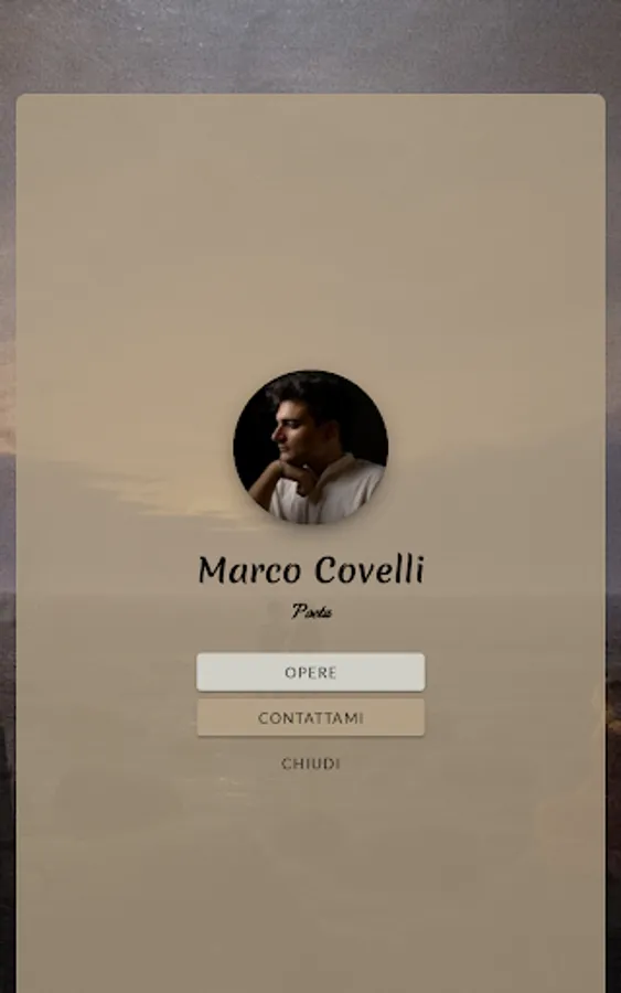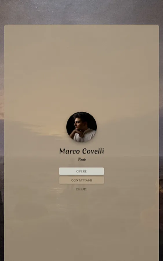 My name is Marco Covelli, I'm 22 and I live in the province of Salerno, in Campania. I want to become a poet, a writer. I would like to communicate to all those who read, my feelings, my thoughts, the things that I have managed to understand and those still incomprehensible; in doing so I hope to be able to create a bond with the reader, and, if possible, teach something, give consolation, advice, be a little guide in times of difficulty, of loss, both for myself and for others.