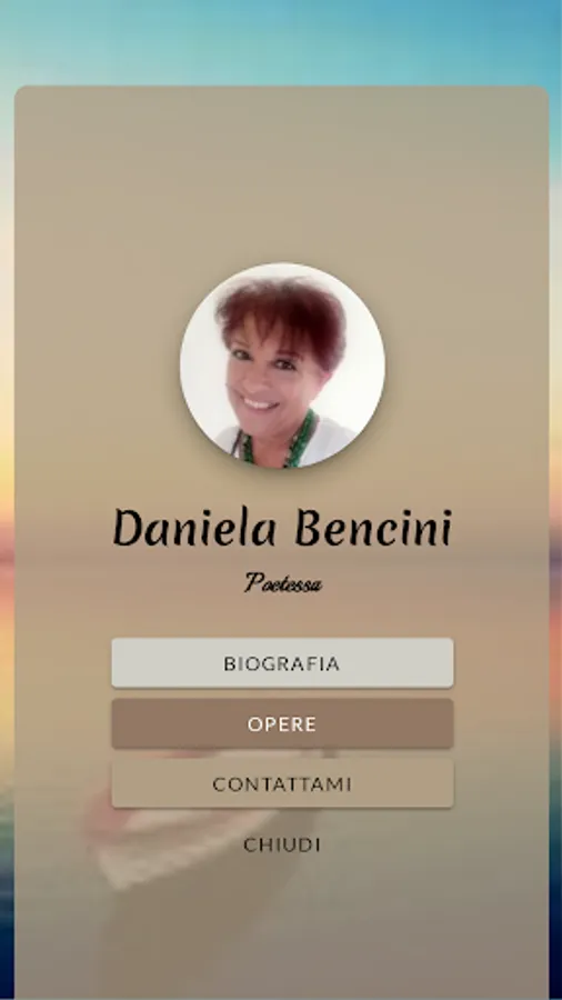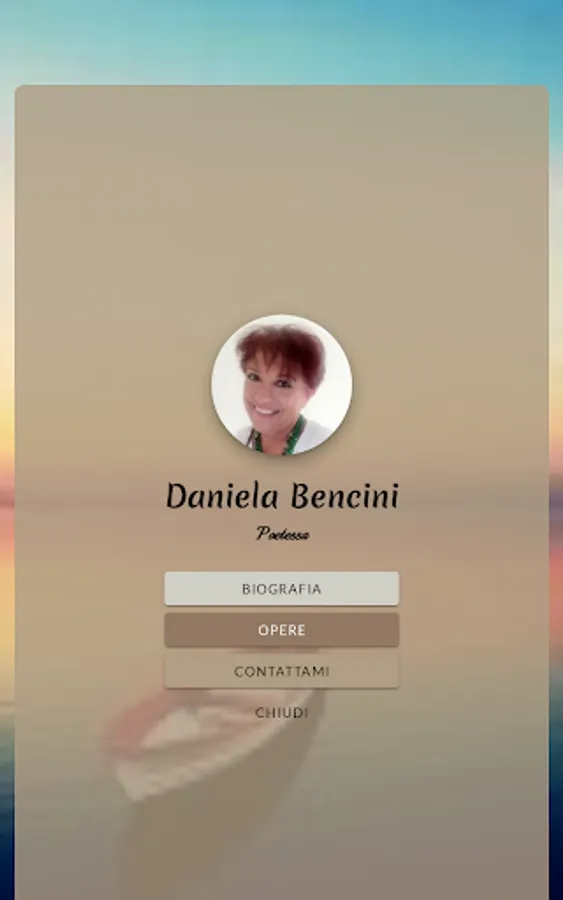 Daniela Bencini was born in Chianti, where she works as a teacher and is also her habitual residence. Except escapes to the sea which, as emerges from his compositions, exerts a great fascination on her. Poet has always participated and won several competitions, last, in chronological order, the bronze Fiorino, at the Florence / Europe international prize. He has participated in various publications together with other authors, his early works are published in a small book "Fili di ferro fili di honey" in '97. In the last period he has been experimenting with short storytelling, as a privileged language to tell and explore the migration issues.
