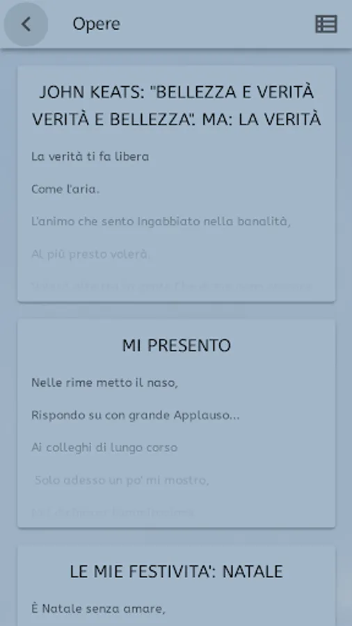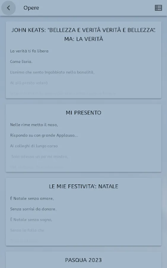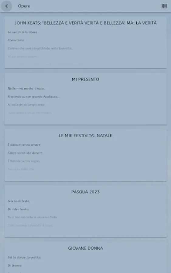 I have often been told that I do not belong to this world; perhaps it is true, because in the world of poetry, I have found the nourishment of my soul. I was born where we ate little, for years, in fact, I believed that escalope was a vegetable... thank goodness, I've always kept to my figure, irony aside, with a lucky marriage and a love affair that has lasted for almost 40 years, I was repaid with sumptuous banquets and with the birth of three splendid children: Salvatore, Diletta and Anna. The dedication and commitment I have made to my family has been great, I would like to reap the fruits of it. For my children I want to be an example of strength and positivity, I contaminate them to the core of this; I wish they never give up. Life is hard but it must always be faced, even when all seems lost. At my house we ate very little, but there was a habit of buying a crossword magazine every week, in which I enjoyed finding answers and puzzles, I can't tell you the enthusiasm when, for the first time, I having the dictionary in my hand, I went over ecstatically those thin slips full of words between my fingers. The vocabulary was stored in the upper floors of the furniture, which made it elusive as well as precious. From these moments the curiosity for the word and its meaning was born, nourished through reading and writing, then poetry. Poetry and I met recently, but we immediately got into perfect harmony, one day :"I sank the pen into the paper and without pride I gave away my thoughts...". writing on these pages has been an unexpected and beautiful gift, it makes me feel proud and privileged, I thank everyone for making this possible; especially my family and all those who can no longer rejoice with me.