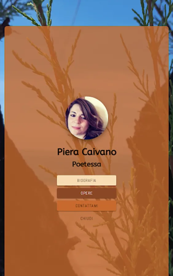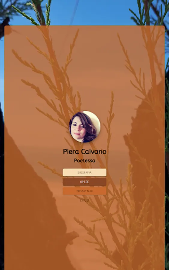 Piera Caivano, born in 1989 in Potenza. Graduated in Primary Education Sciences. Support teacher in kindergarten. He has published the poetry collections Floral (2020), Bocciolo nel mare (2021), Rosa dell'inverno (2022), Rubino di Venere (2022) and the fable Melania with a golden heart (2022) obtaining various awards in literary competitions .