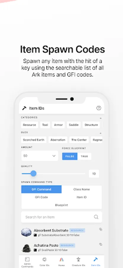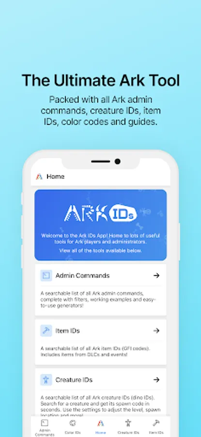Ark IDs is the most popular Ark admin commands and spawn codes website, and now we’re available on the app store! Find out about our features below.