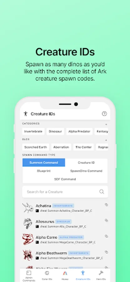 Our creature and dino ID list contains all creatures from Ark and DLCs. Simply search for a creature and get the command to spawn it in-game. Use the filters to view creatures from specific DLCs and categories.
