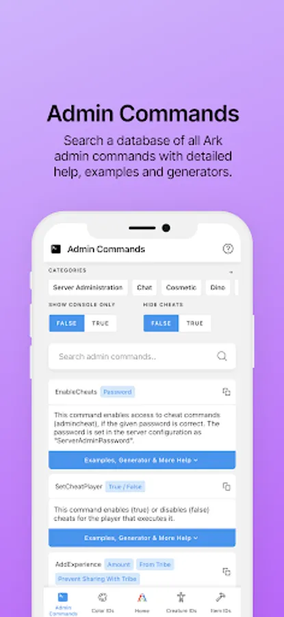 Find documentation for every Ark console command in an instant with our up-to-date admin commands database. Each command is complete with working examples and generators. The command generators allow you to adjust all of the parameters in app, outputting a working command for you to enter in-game.