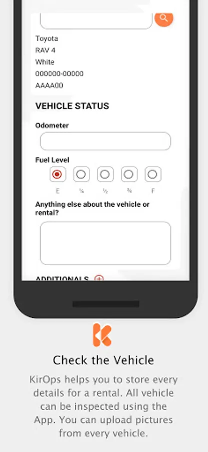 With KirOps App you can create new rentals for your customers, inspect the vehicle to start or to finish a rental. You can include up to 6 pictures from the vehicle in each case.