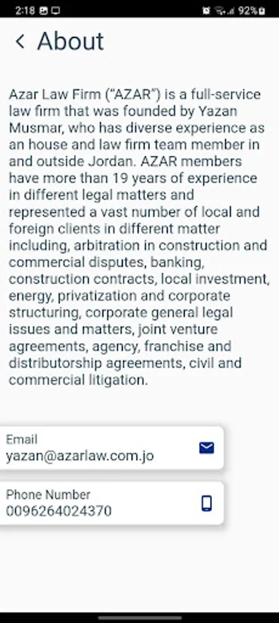 AZAR members have more than 19 years of experience in different legal matters and represented a vast number of local and foreign clients in different matter including, arbitration in construction and commercial disputes, banking, construction contracts, local investment, energy, privatization and corporate structuring, corporate general legal issues and matters, joint venture agreements, agency, franchise and distributorship agreements, civil and commercial litigation.