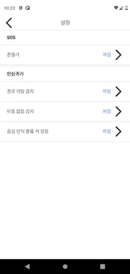 6. In the settings, you can set the width of the emergency situation to be wide or narrow by setting the sensitivity of shaking the smartphone, setting the departure radius of the route on the way home, turning on/off the emergency sound with the volume key, and turning on/off the detection of no movement.