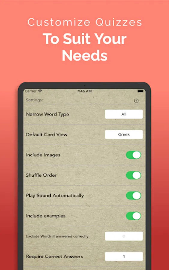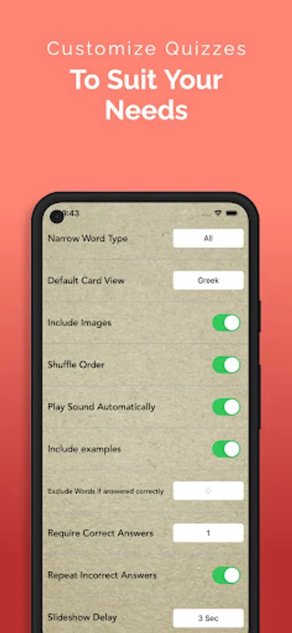 Tailor quizzes to your needs, including as much or as little of the extra content as you want. Or sit back and study in slideshow mode, even while driving! Either way, you'll be acing those vocab tests in no time.