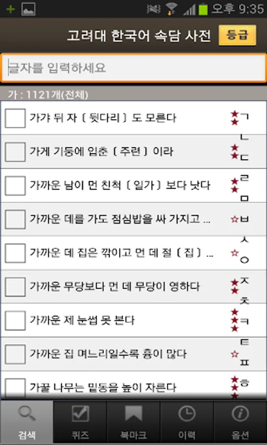 * 맞춤식 속담 학습을 할 수 있도록 총 7,411개의 방대한 속담을 수준별로 제시