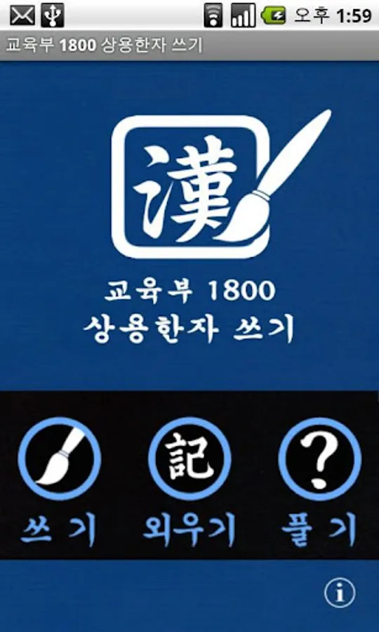 <교육부 1800 상용한자 쓰기> 앱은 교육부에서 지정한 한문교육용 기초 한자를 중학교 및 고등학교 과정으로 분류하여 각 수준별로 학습자가 쓸 수 있도록 구성한 프로그램입니다.
