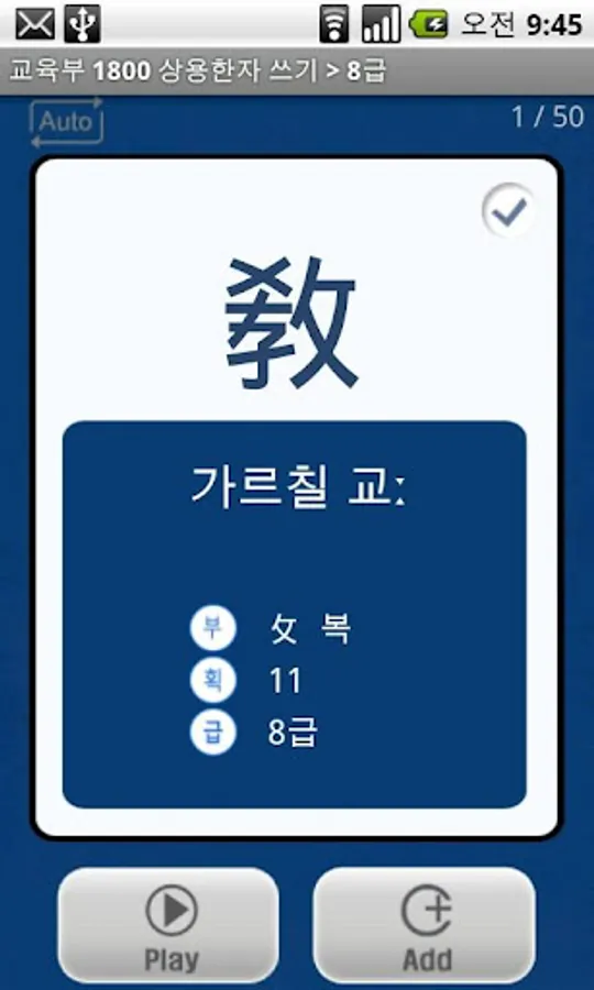 쓰기 기능 외에 외우기, 풀기 등의 기능을 탑재하여 총체적인 한자 학습이 가능하도록 구성하였습니다.