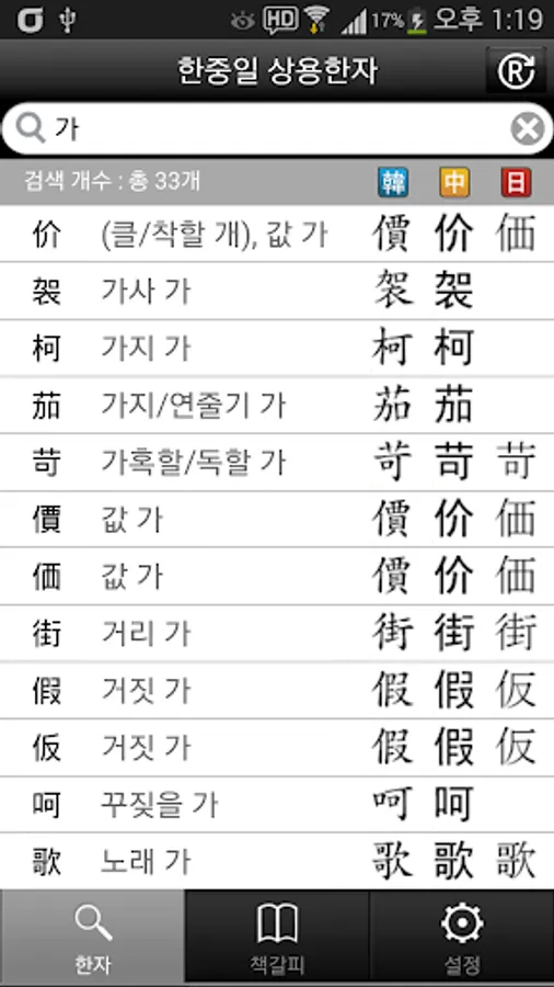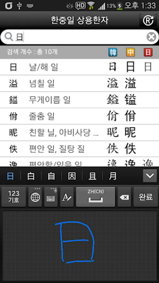 한중일 한자 비교사전은 한국, 중국, 일본 3국의 상용한자를 비교·학습할 수 있도록 구성한 애플리케이션입니다.