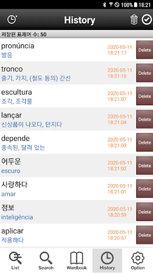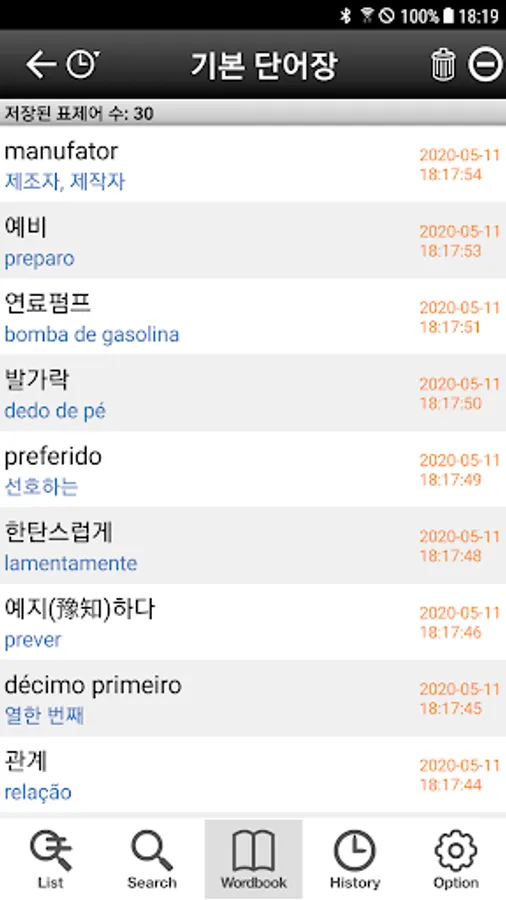 4. 최근 검색한 단어를 찾아볼 수 있는 History 기능 지원