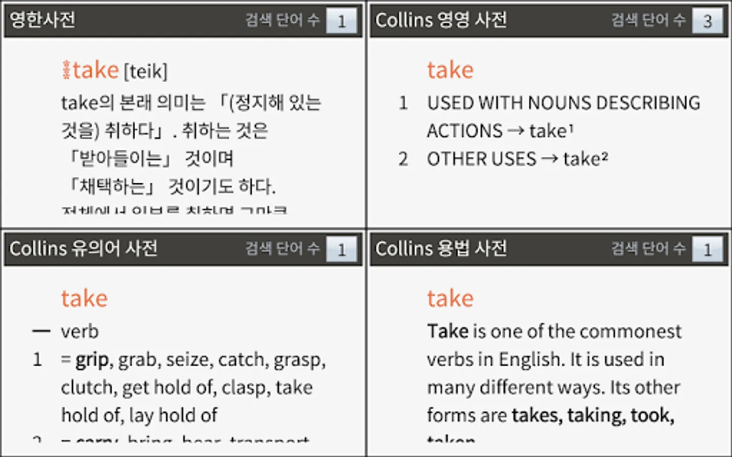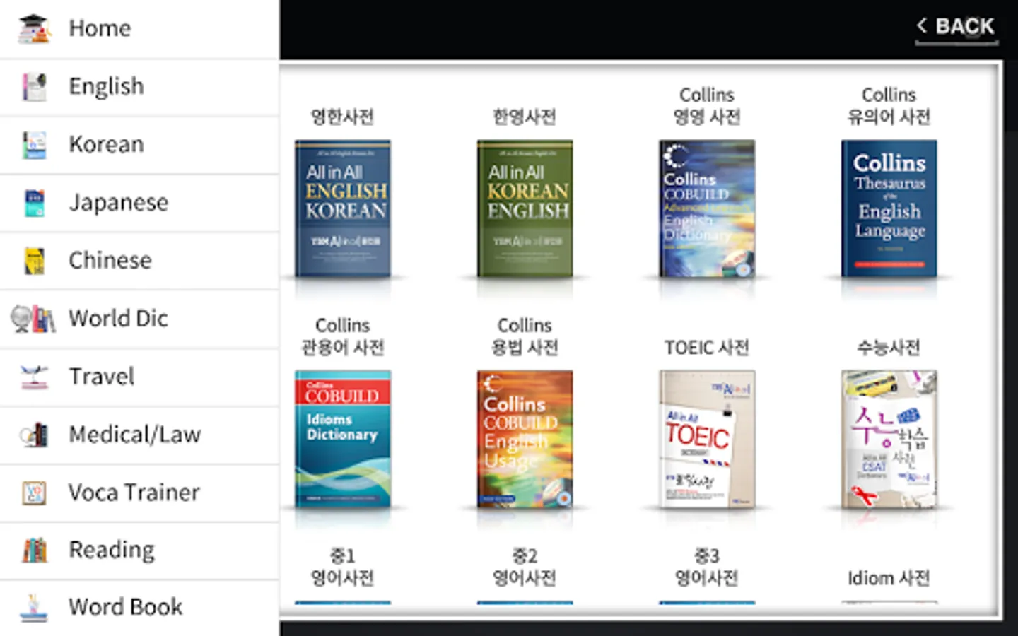 - Equipped with YBM, which has the highest public confidence in Korea, and Collins language dictionary of international standards.
