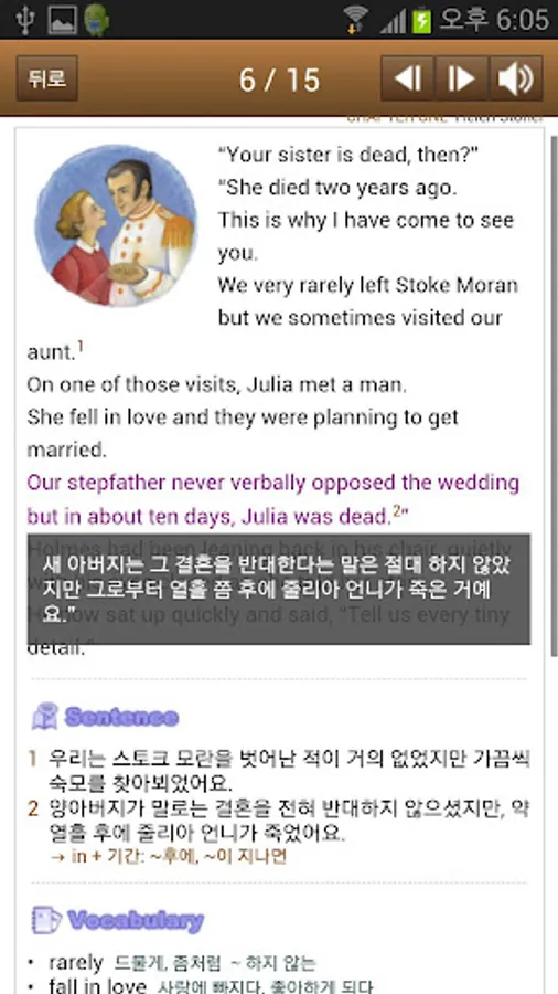 3. 문장 터치를 통해 한글 독해문 내용을 확인할 수 있습니다.