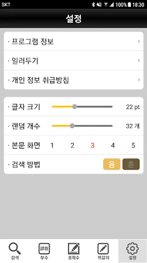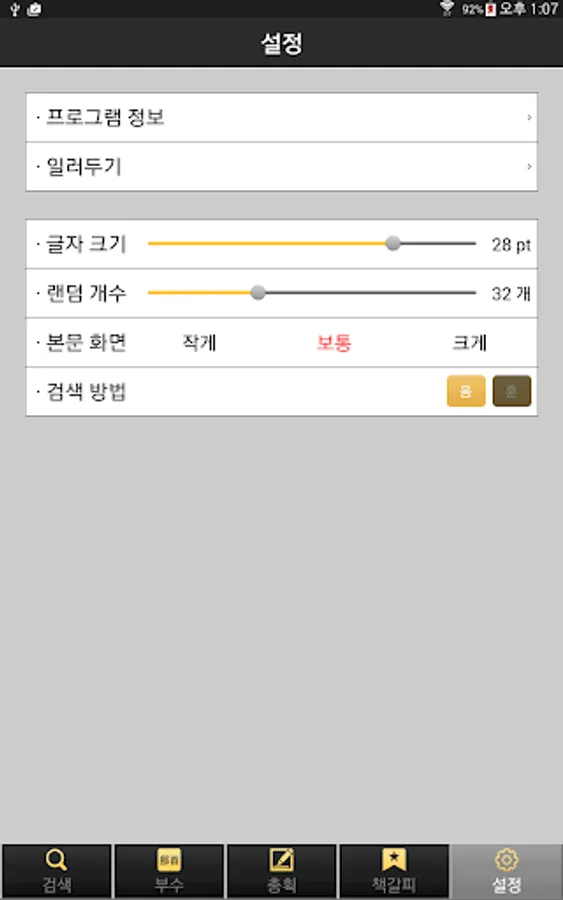 -글자 크기(목록) 조절/랜덤 표제어 개수/본문 화면 사이즈 조절/검색 방법(음.훈) 설정 외